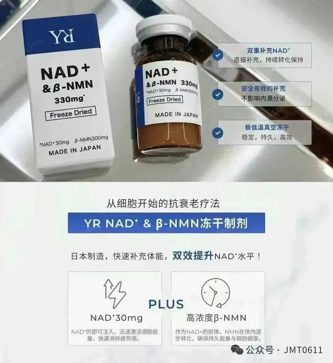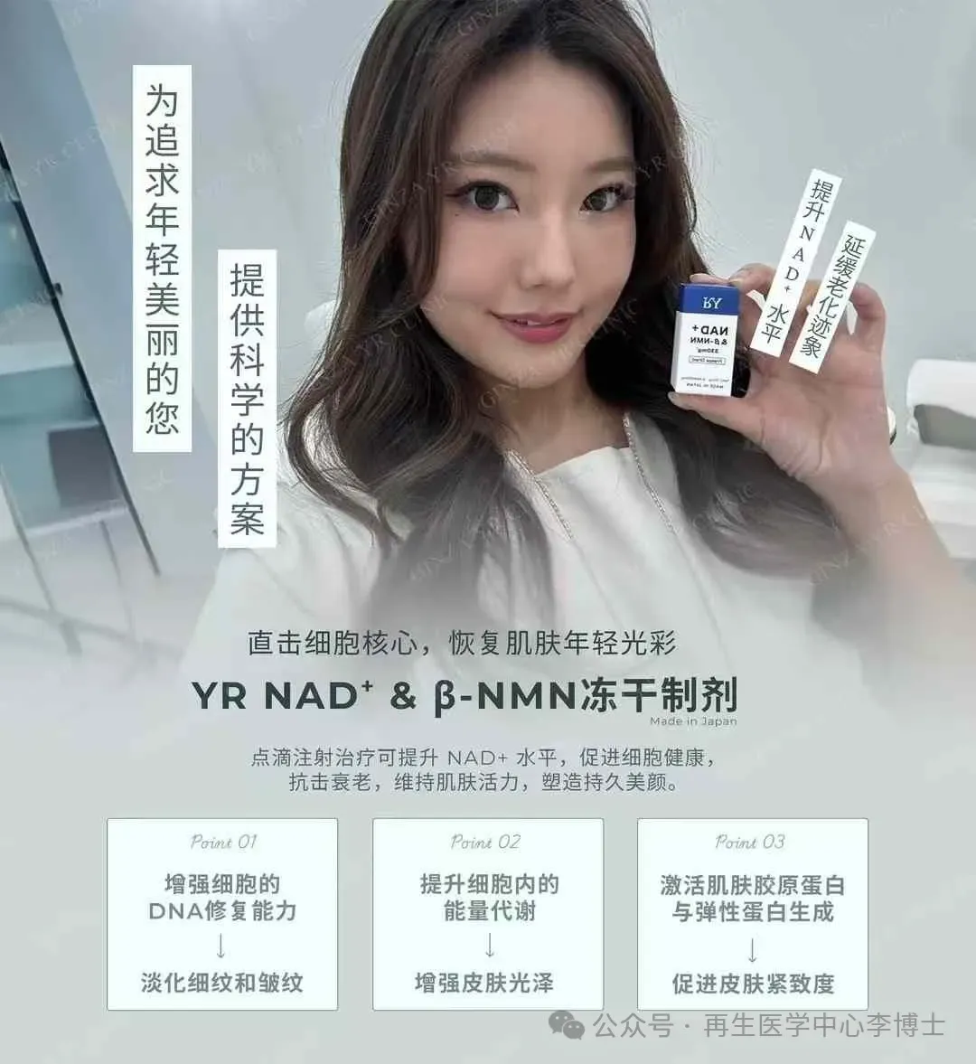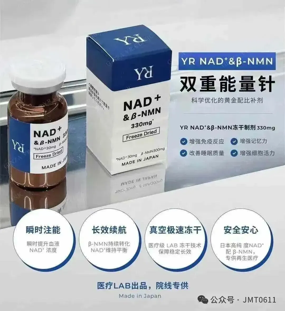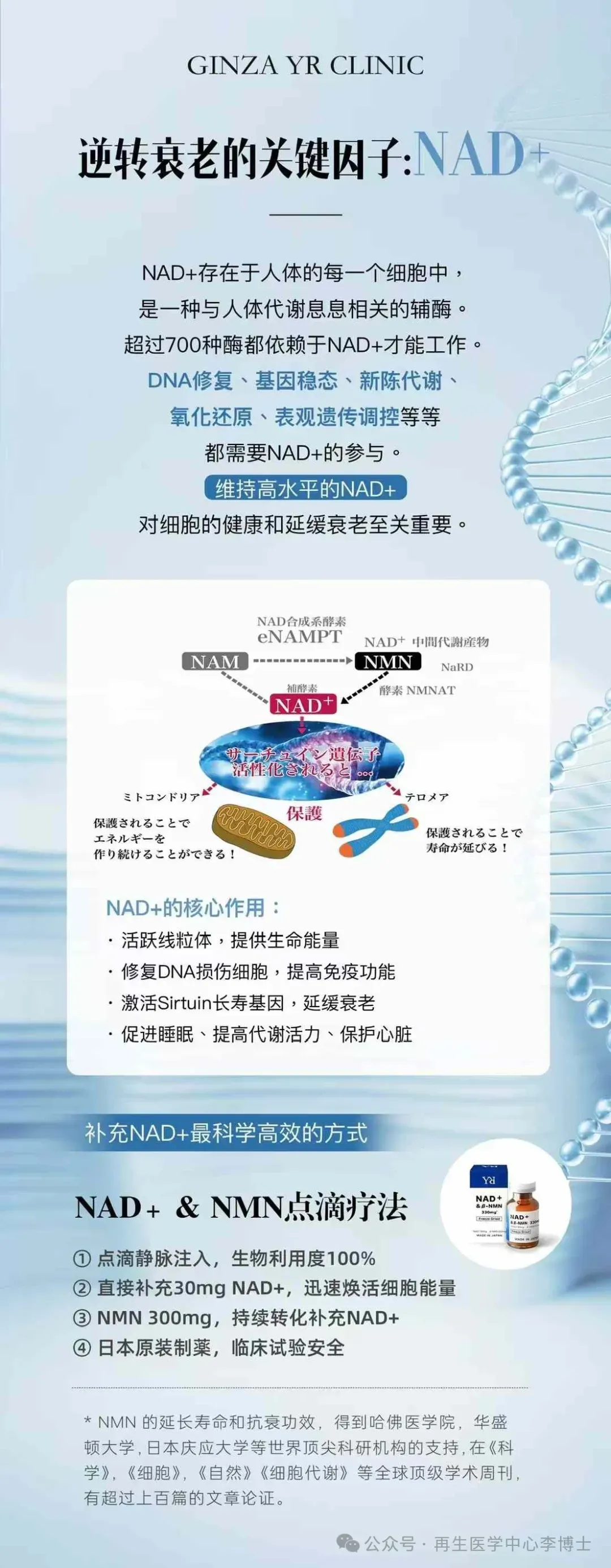 💙日本銀座YR Clinic顶级推荐 NAD+&βNMN330mg黄金比例细胞抗衰能量针。纯生物制剂,不含化工合成NMN 日清原料荣誉出品。双重平衡补充完美配比,吸收转化率极高,即时感受与持续延缓衰老效果更好。