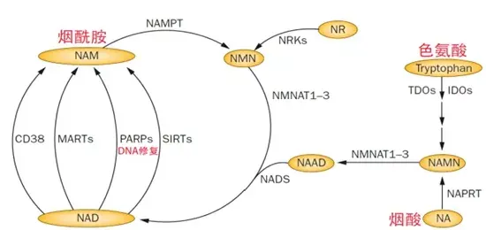 Sirtuins、线粒体酶、PARPs、CD38、脱氢酶等广泛依赖NAD+。