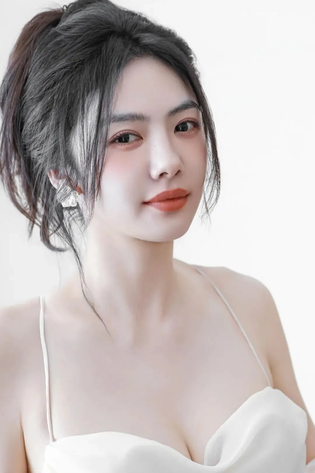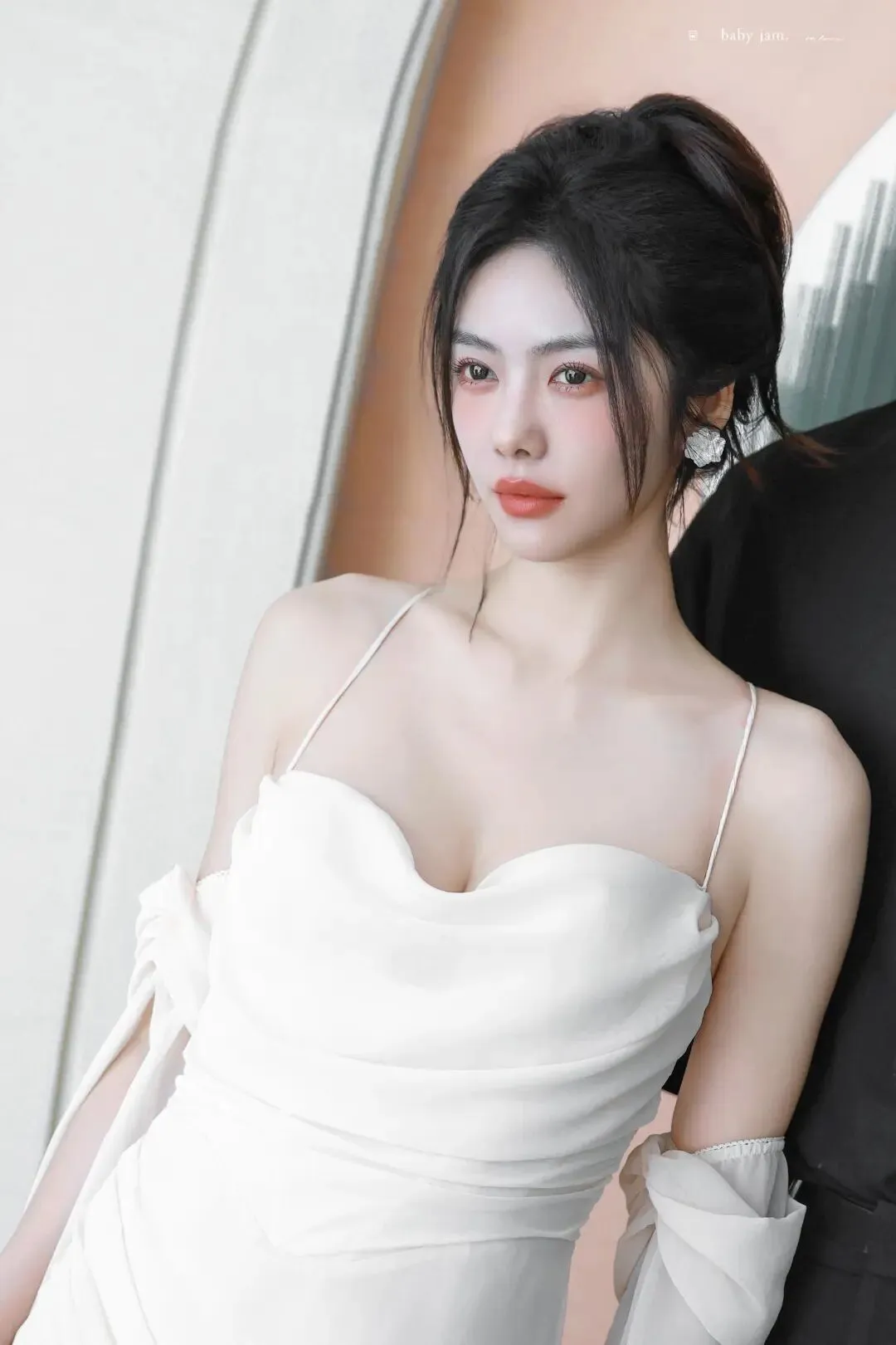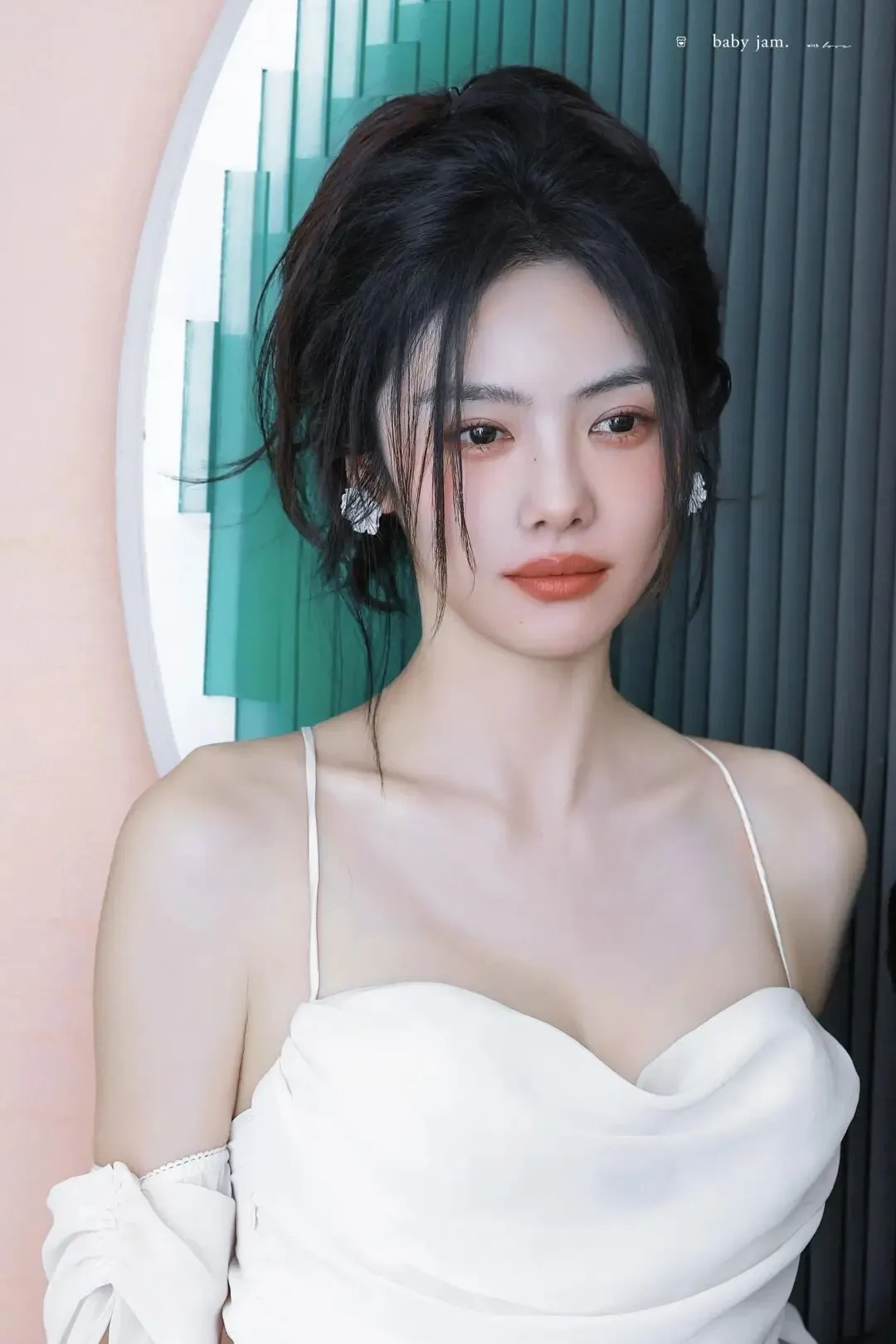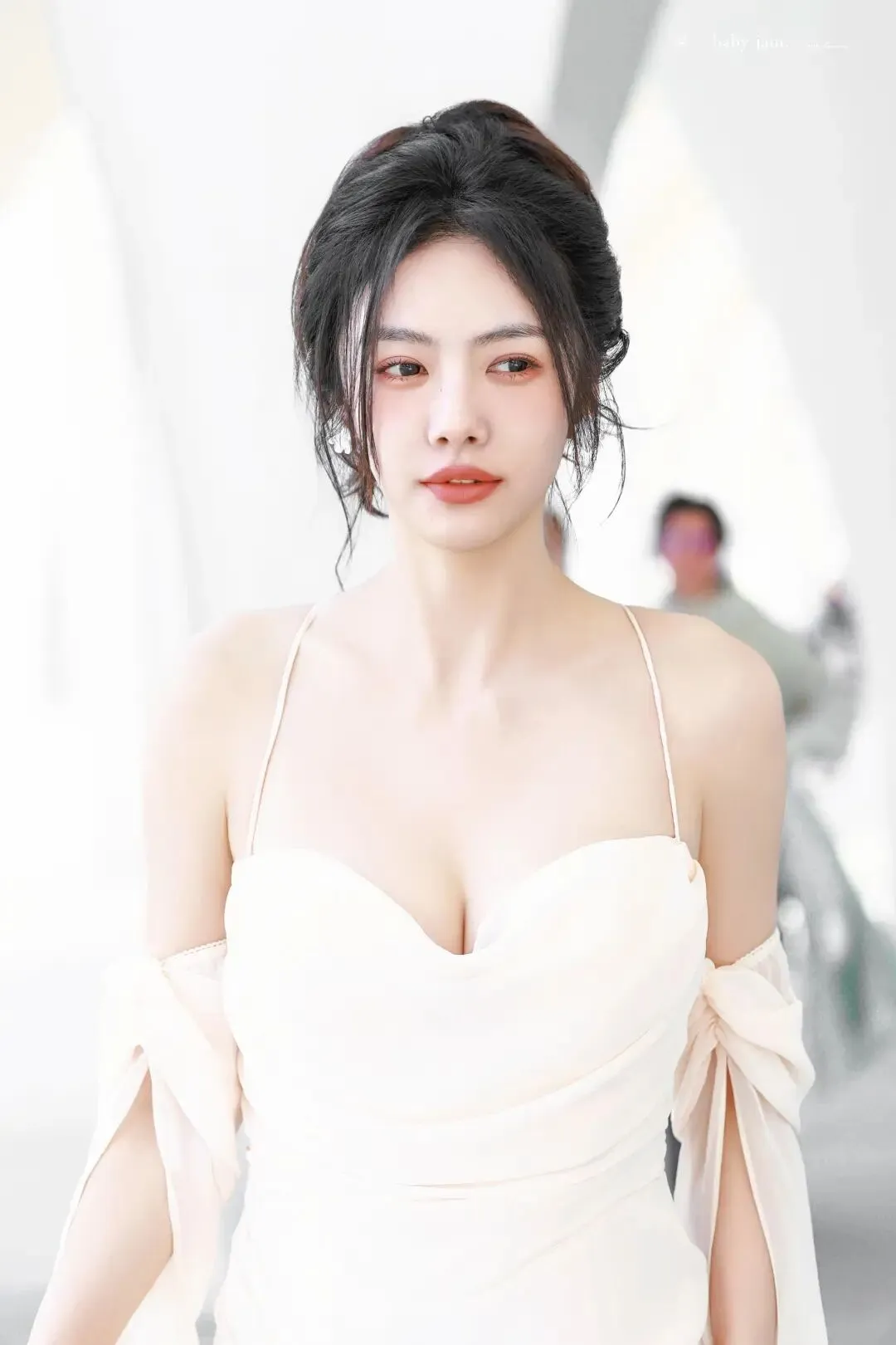 细节之处更见质感,配饰的点缀让造型更具层次感。简约的银质耳饰、小巧的戒指,没有过度张扬,却精准提升了整体造型的精致度,与白裙的纯净形成巧妙呼应。她的妆容清透自然,裸色系口红衬得肤色愈发白皙,眉眼间不添过多修饰,却自带灵气,完美诠释了“清水出芙蓉,天然去雕饰”的美感,让白裙的简约之美更具感染力。