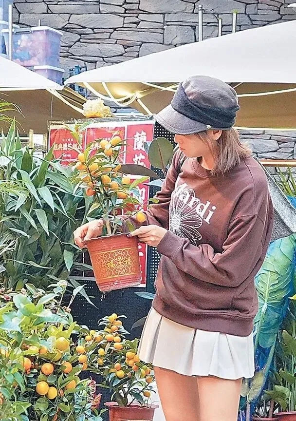 關嘉敏拿起盆桔望完又望。