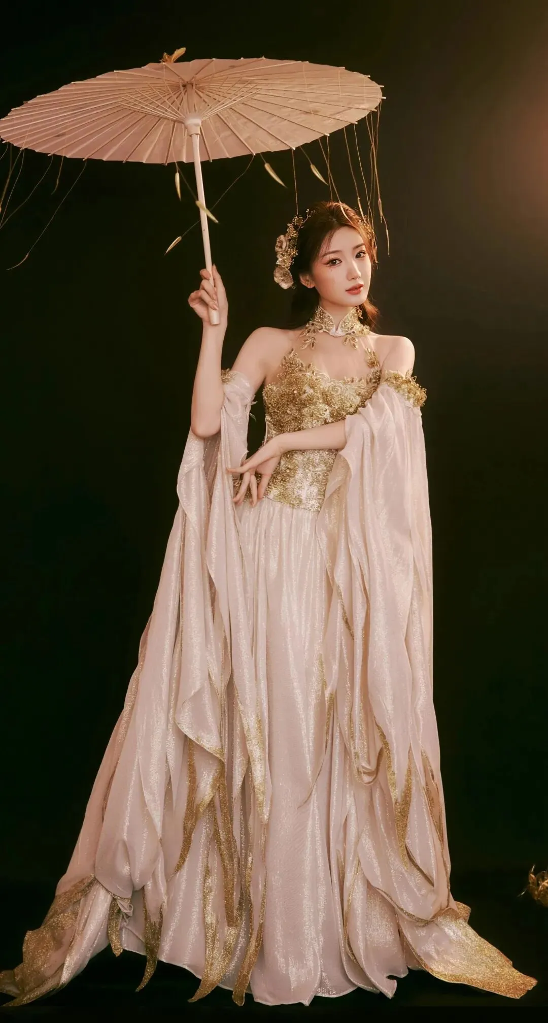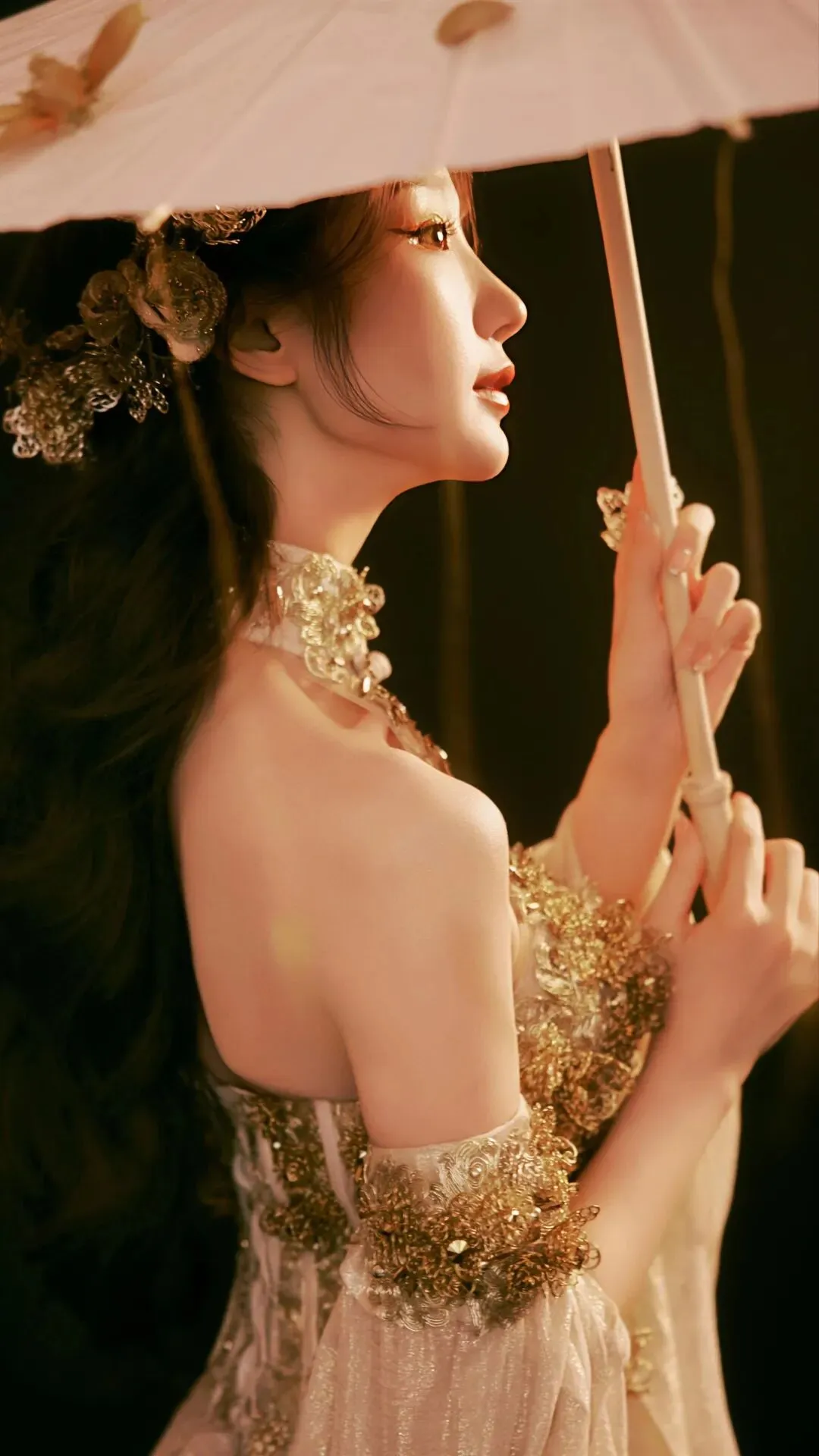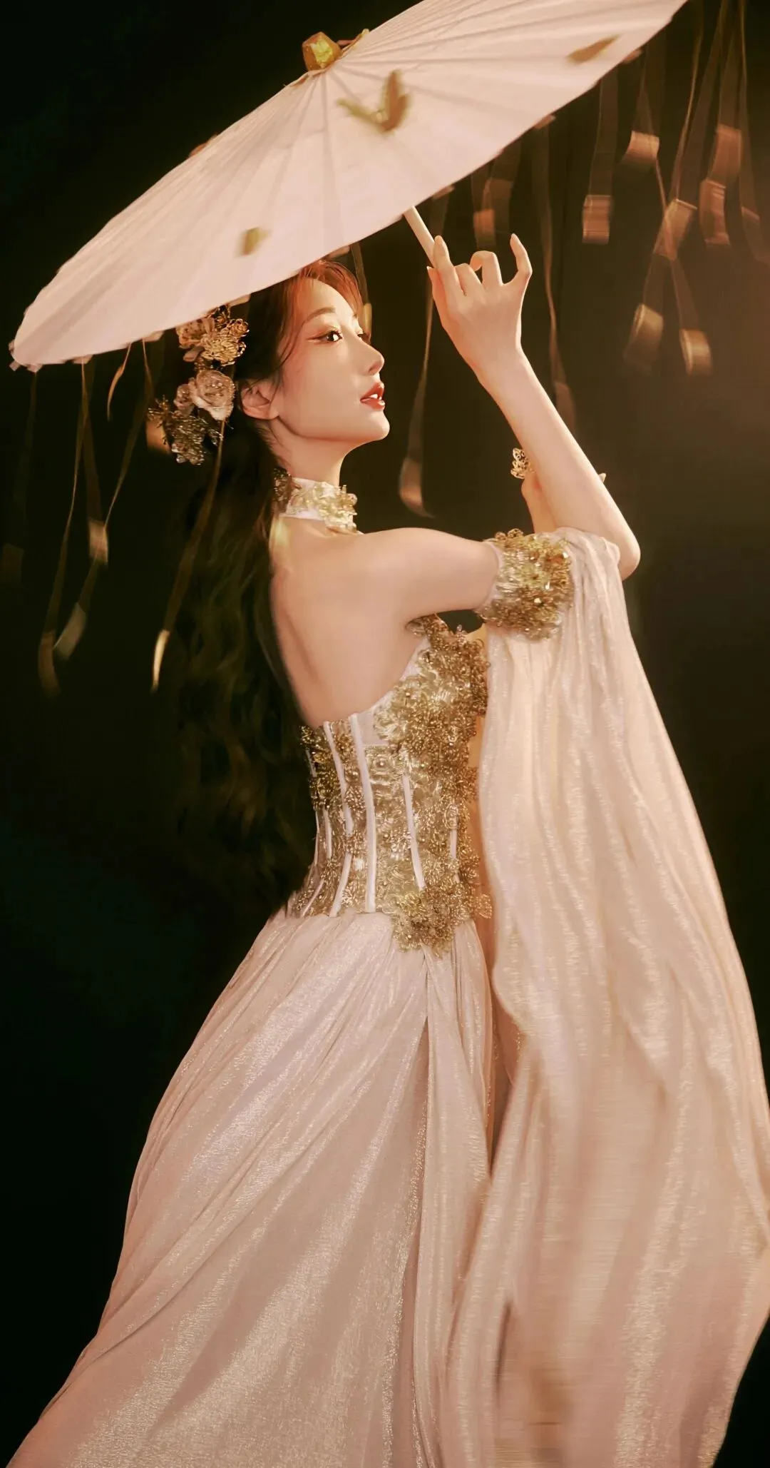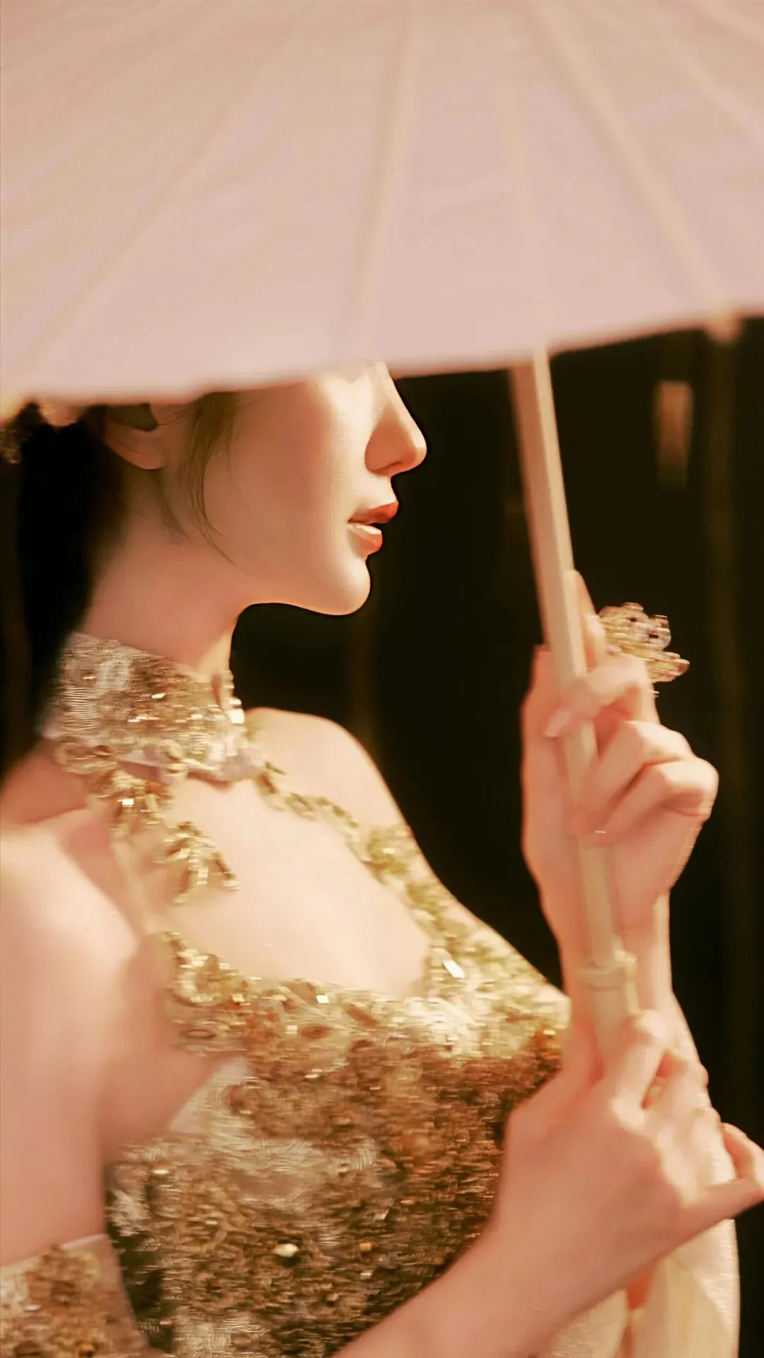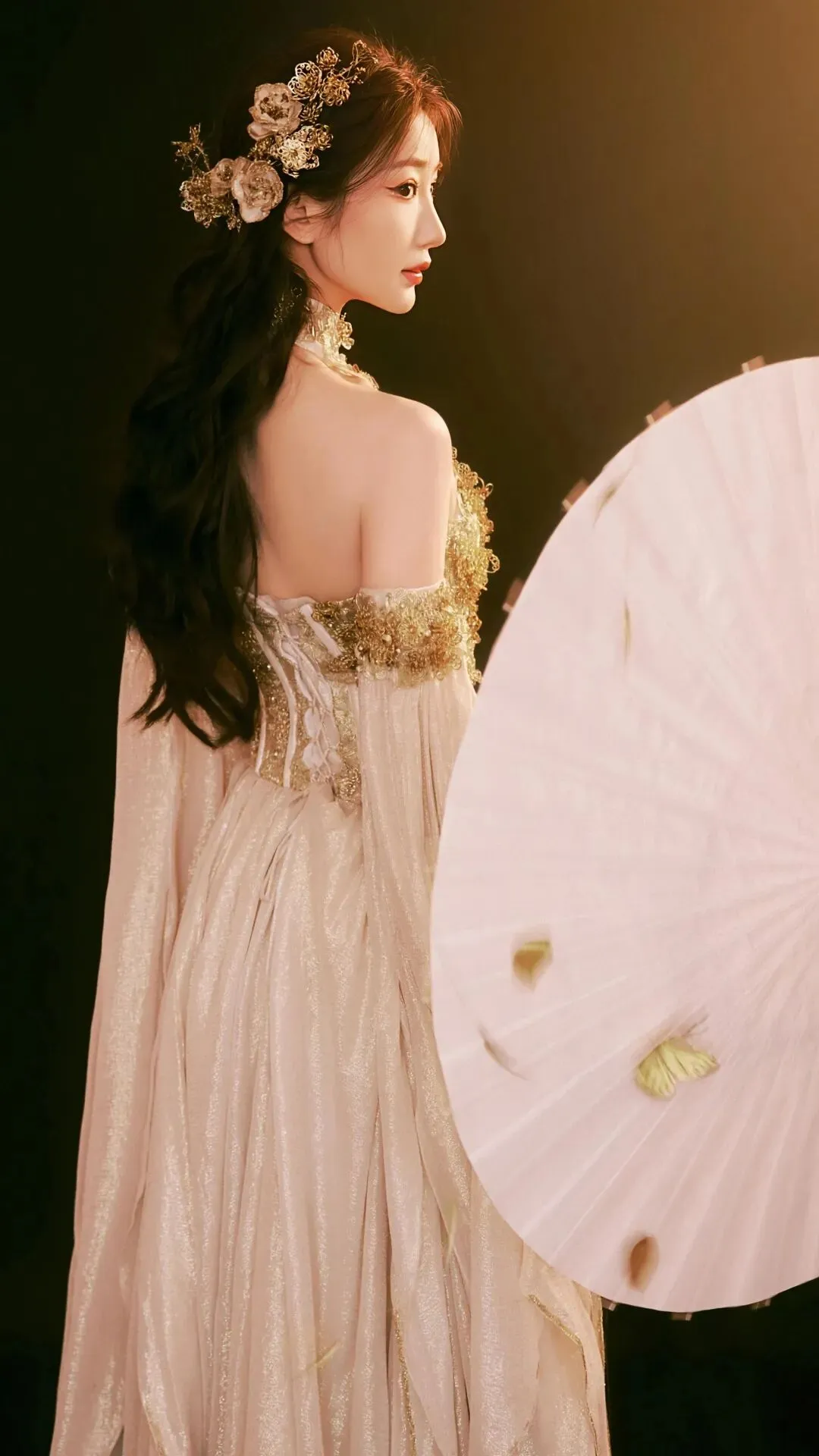 挂脖的设计巧妙勾勒出她优美的直角肩与流畅的背部线条,显露的锁骨精致玲珑,每一处起伏都透着东方女性独有的含蓄性感。