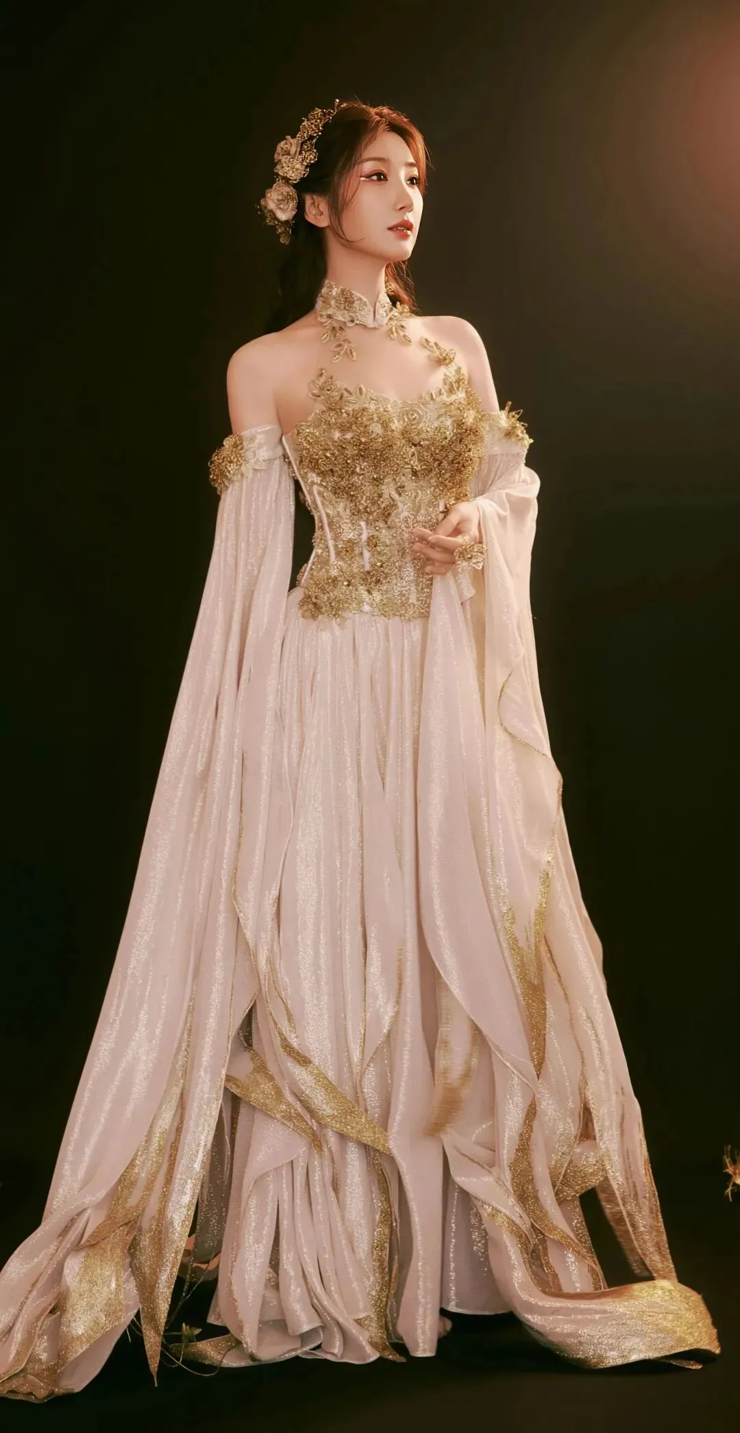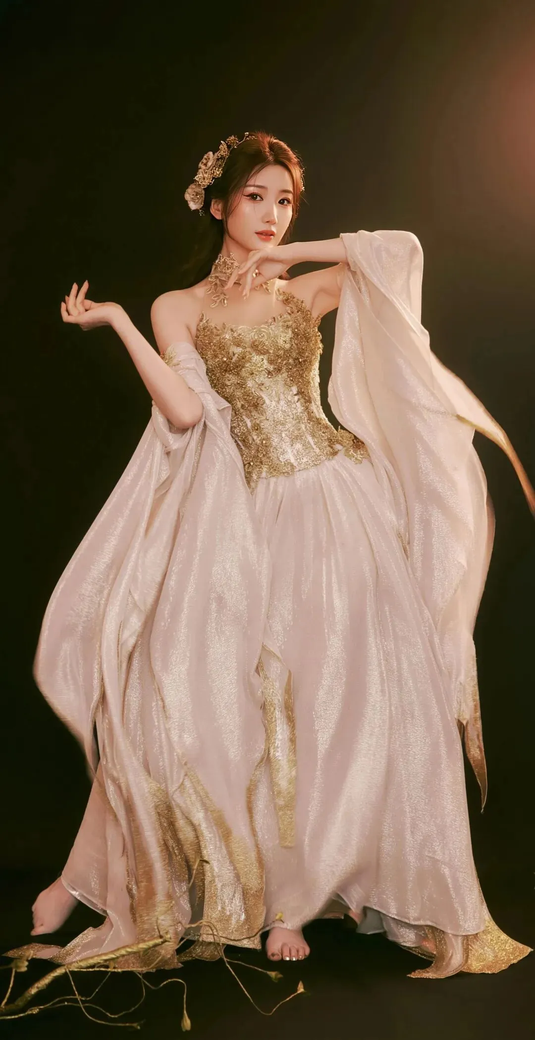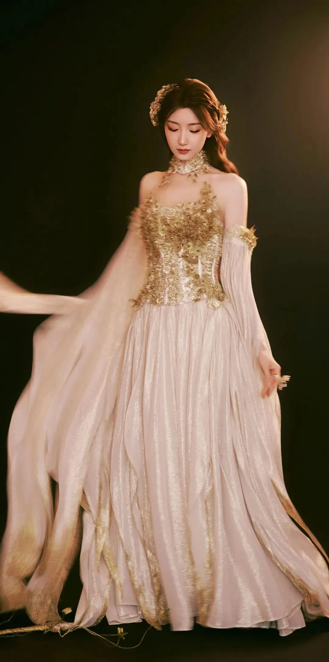 当她微微侧身或低眉浅笑时,裙摆随着动作轻轻摆动,整个人仿佛笼罩在一层温柔的光晕中。