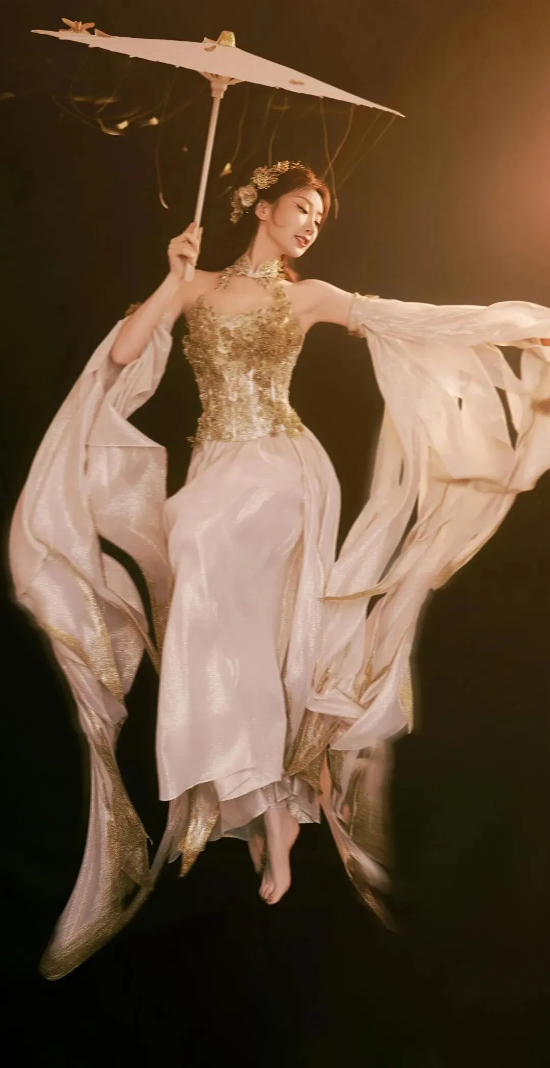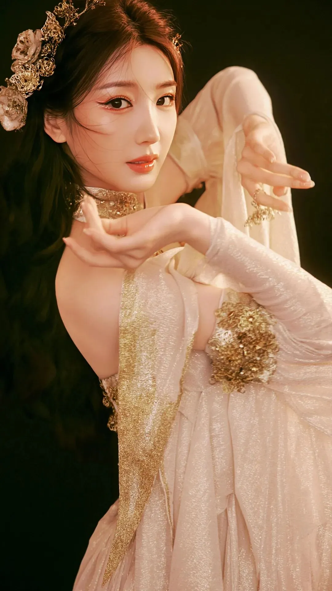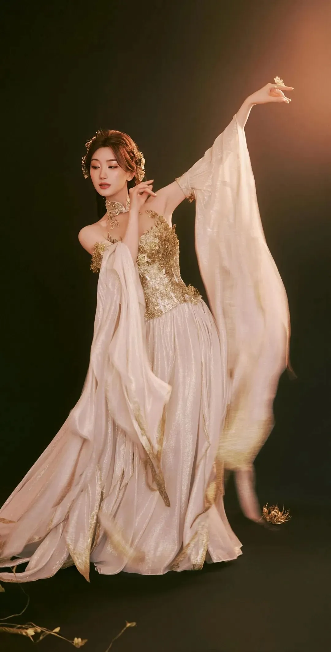 当她微微侧身或低眉浅笑时,裙摆随着动作轻轻摆动,整个人仿佛笼罩在一层温柔的光晕中。