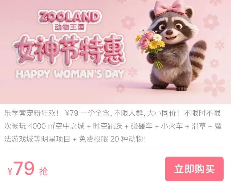 【明日开园】女神节超宠你!¥79一票通玩ZooLand动物王国!大小同价,萌宠 + 游乐全场项目不限时不限次,无二销痛快耍!