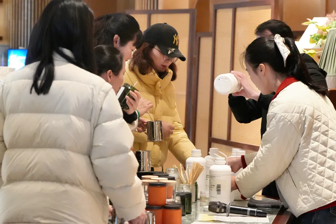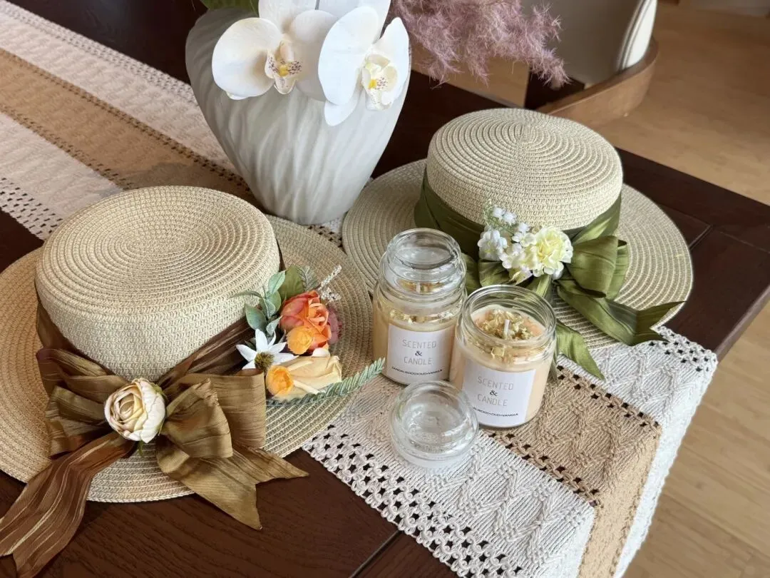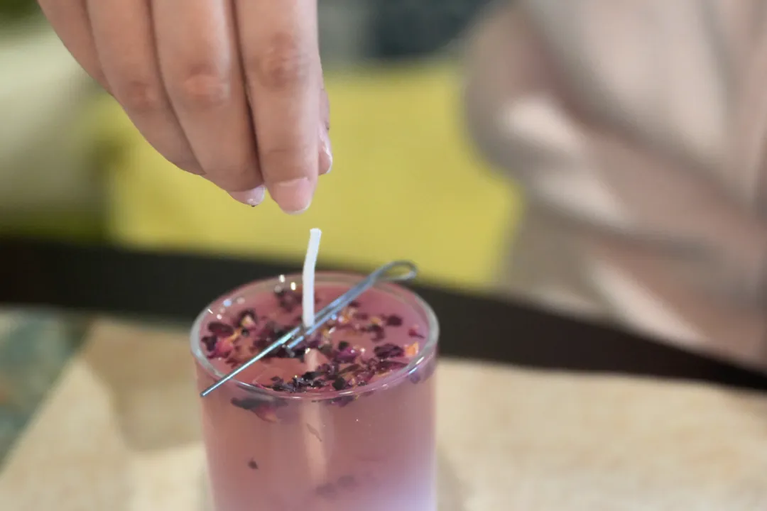 在专业的香氛台前,陈列着天然大豆蜡与多种植物香氛及干花等装饰材料。在导师的指引下,大家化身调香师,精心挑选心仪的香型,并调配出喜爱的色彩,徐徐倒入精致的杯中,等待凝固的过程,是一段全然放松的专注时光。