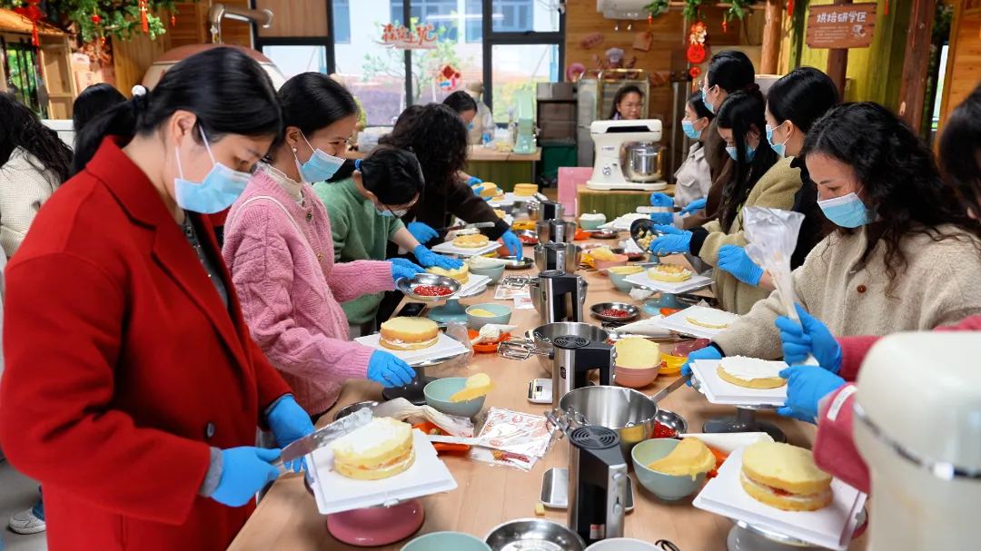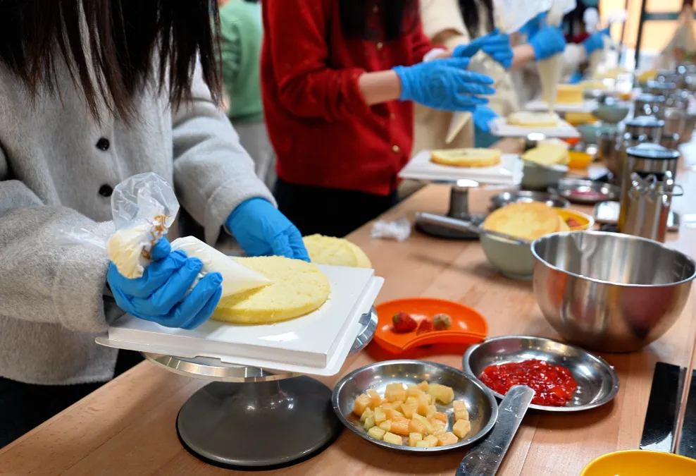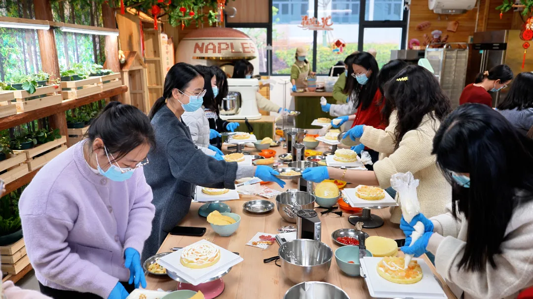 系上围裙,大家分组协作,化身蛋糕设计师。从涂抹均匀的奶油开始,用缤纷的果酱与裱花嘴勾勒图案,再以新鲜水果、巧克力饰件进行创意点缀。无论是描绘花卉的柔美,还是书写节日祝福,在欢声笑语与默契配合中,一个个精致可爱的主题蛋糕精彩呈现。这份亲手完成的甜蜜,是送给自己与同伴最温馨的礼物。