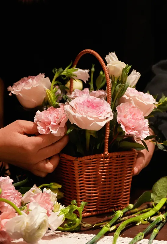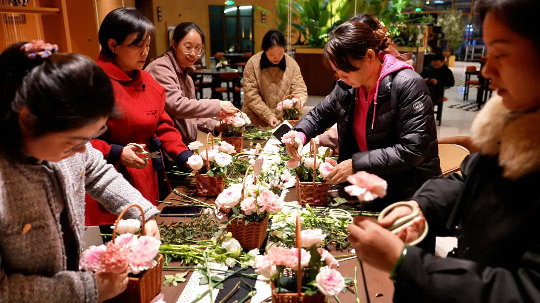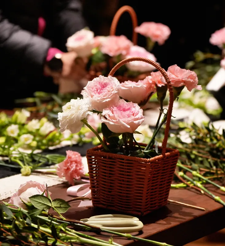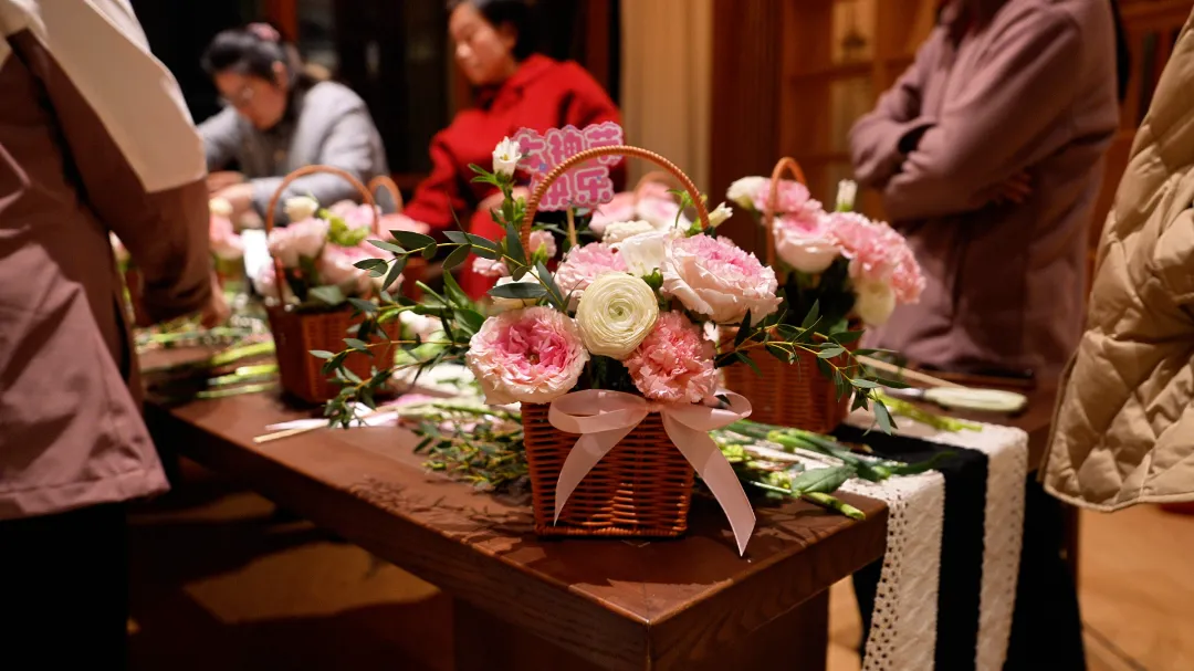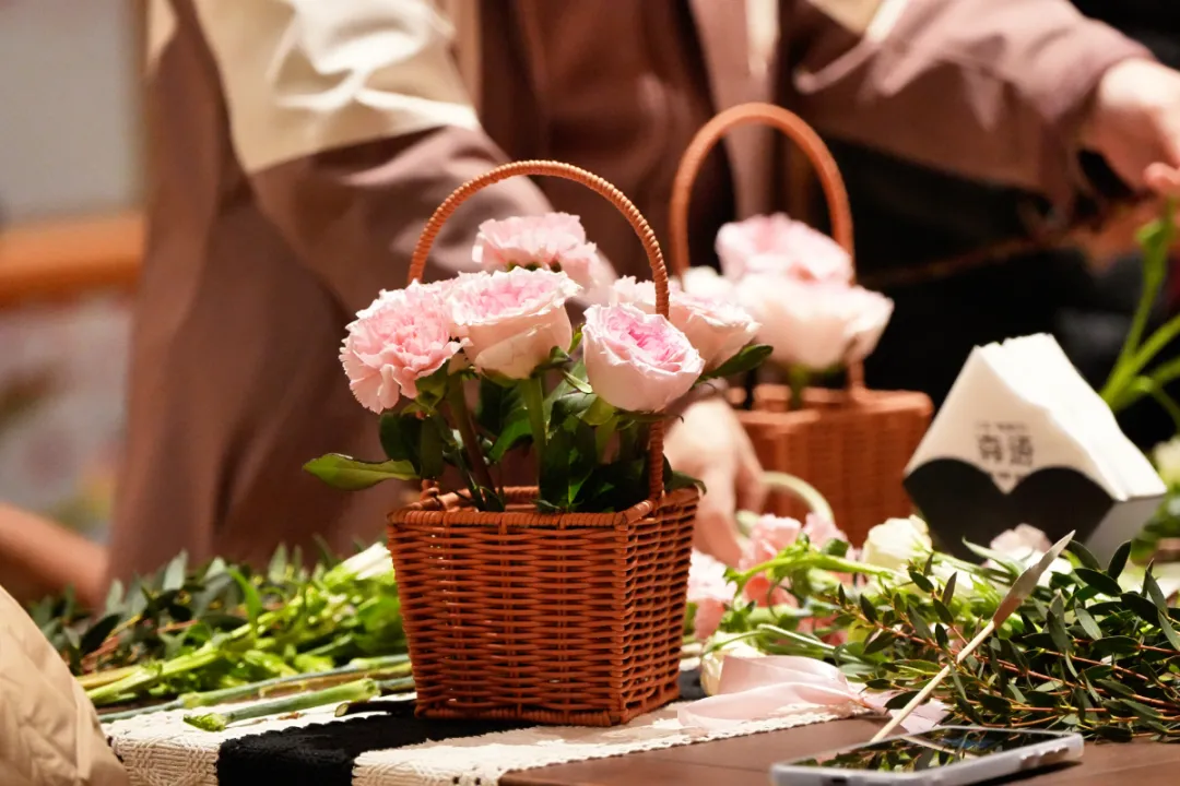 在花艺师的细致讲解下,以“笔架山春色”为灵感,学习花卉的挑选、修剪与构图技巧。指尖轻触柔嫩的花枝,将玫瑰的馥郁、洋玫瑰的清雅与枝叶的灵动,精心构思,安插于花器之中。顷刻间,一篮篮生机勃勃、各具巧思的插花作品在指尖诞生,仿佛将窗外山野的烂漫春色,微缩成可随身携带的灵动风景。