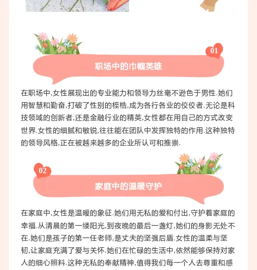 结尾加入互动引导,比如"留言分享你的女神故事" 这样既有节日氛围,又能达到活动宣传效果。在小墨鹰排版时,可以用不同样式区分这几个部分,让文章更有层次感。