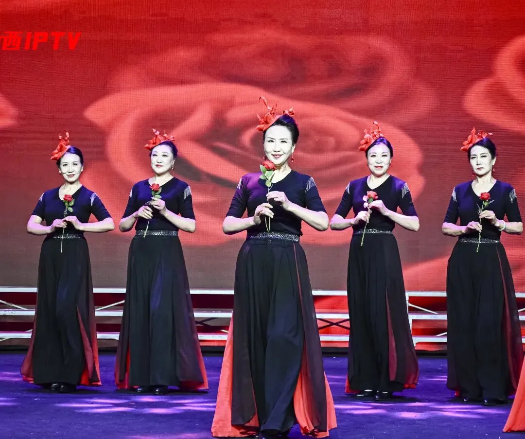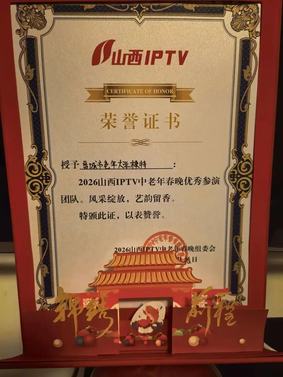 轻舞醉夕阳, 银龄耀春晚——晋城市老年大学模特队,2025年底,在校成功举办了一场精彩纷呈的迎新年联欢会,节目《轻舞》被相关部门推荐到省电视台ⅠPTV中老年春晚栏目,在校领导及办公室高度重视、大力支持下,将其节目冲刺春晚舞台上,以一场名为《轻舞》优雅台步与从容神采,生动诠释新时代银龄群体的精神风貌,成为晚会现场一道亮丽的风景线。