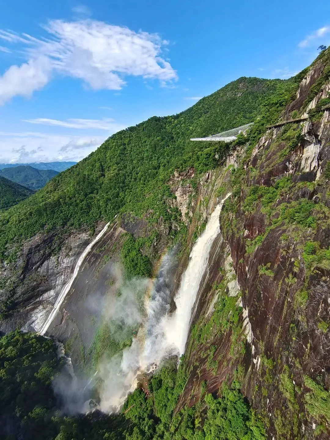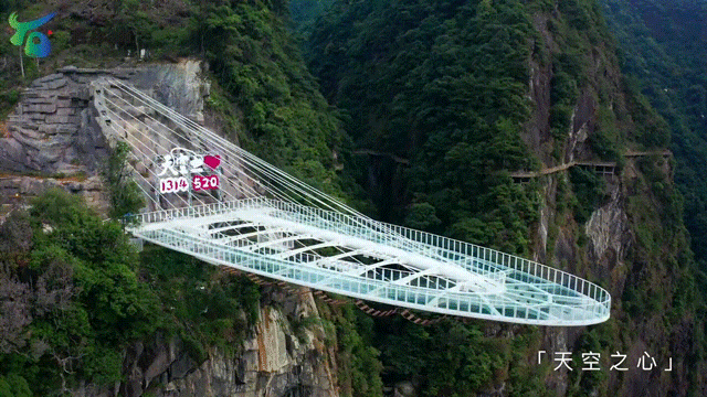 悬空高度314米,下面是深不见底的悬崖峭壁和奔腾而下的瀑布,是景区的网红打卡点和爱情圣地。