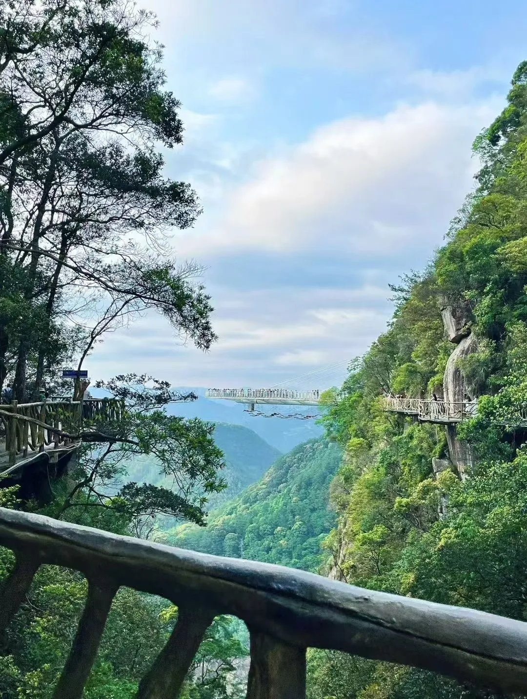 悬空高度314米,下面是深不见底的悬崖峭壁和奔腾而下的瀑布,是景区的网红打卡点和爱情圣地。
