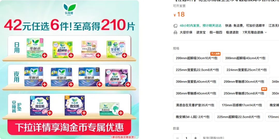 任选⑥件,券后39.6元下拉详情页淘金币抵扣到手35.8元,安睡裤/日用/夜用卫生巾,任意挑!蕞多可撸210片,折1毛/片!