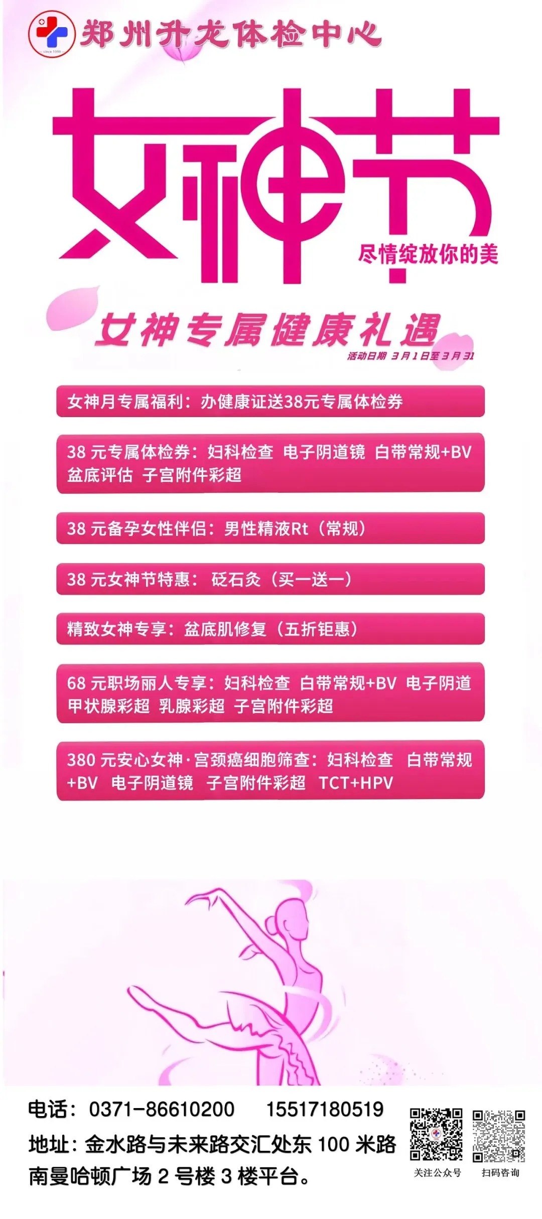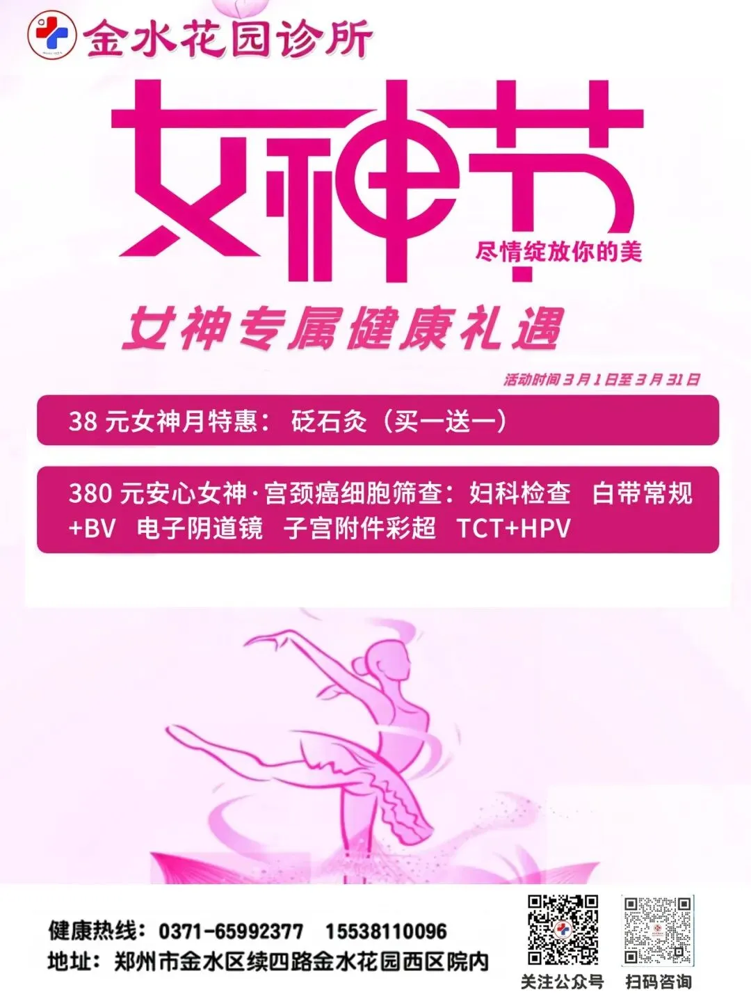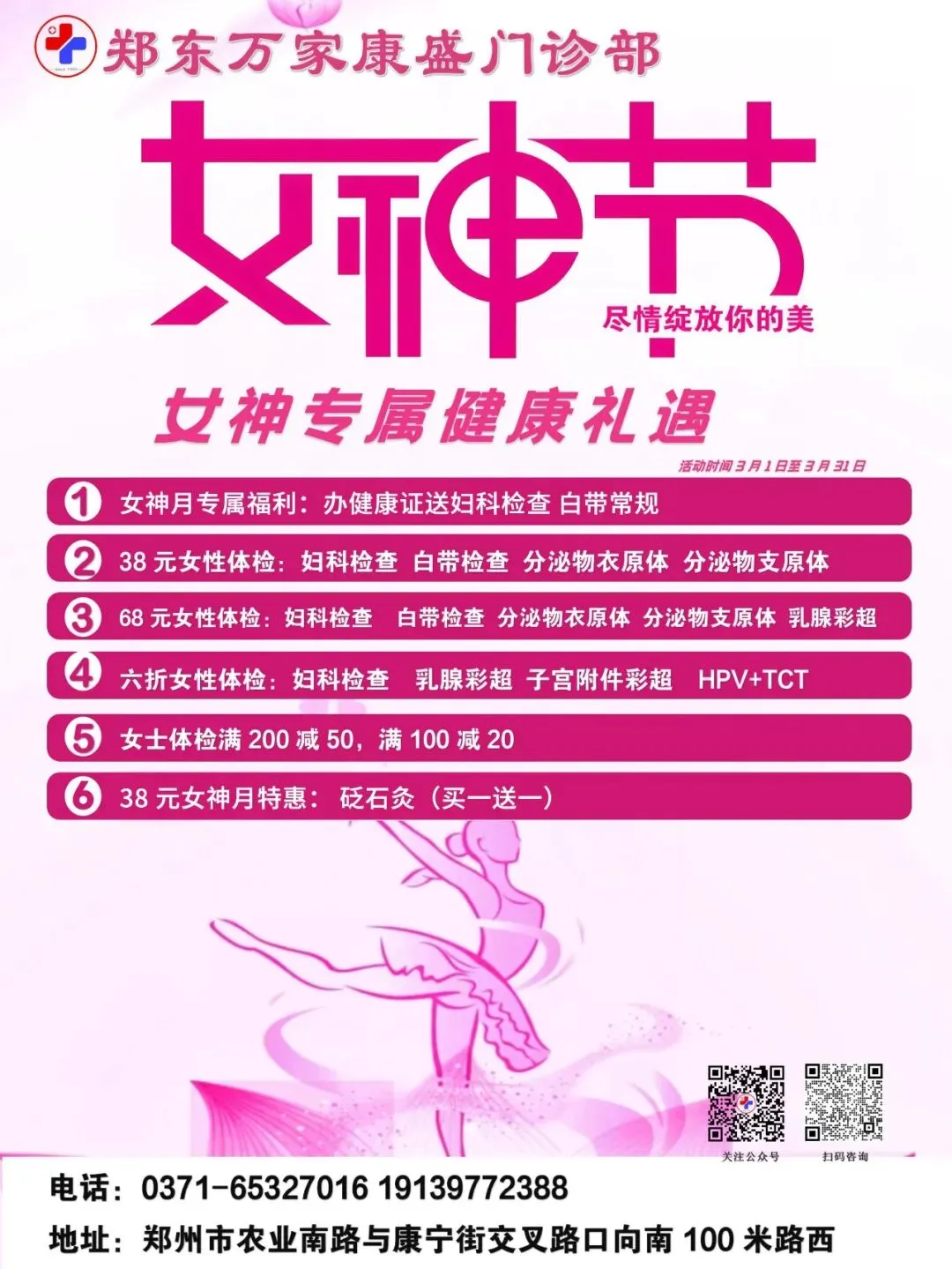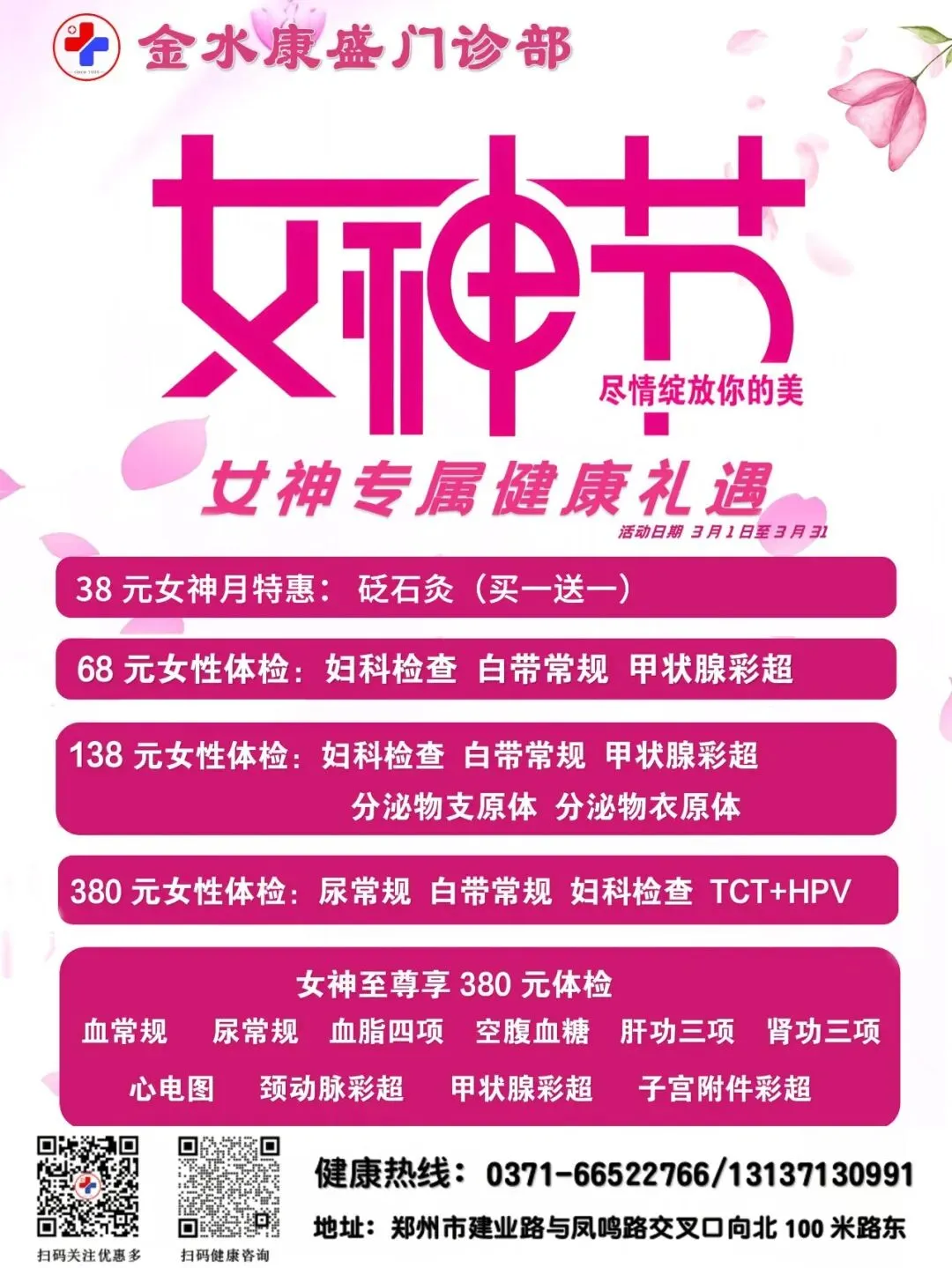 为更好守护女性健康,金水康盛门诊部、郑州升龙体检中心、郑东万家康盛门诊部、金水花园诊所,同步推出多重特惠体检与养护项目。