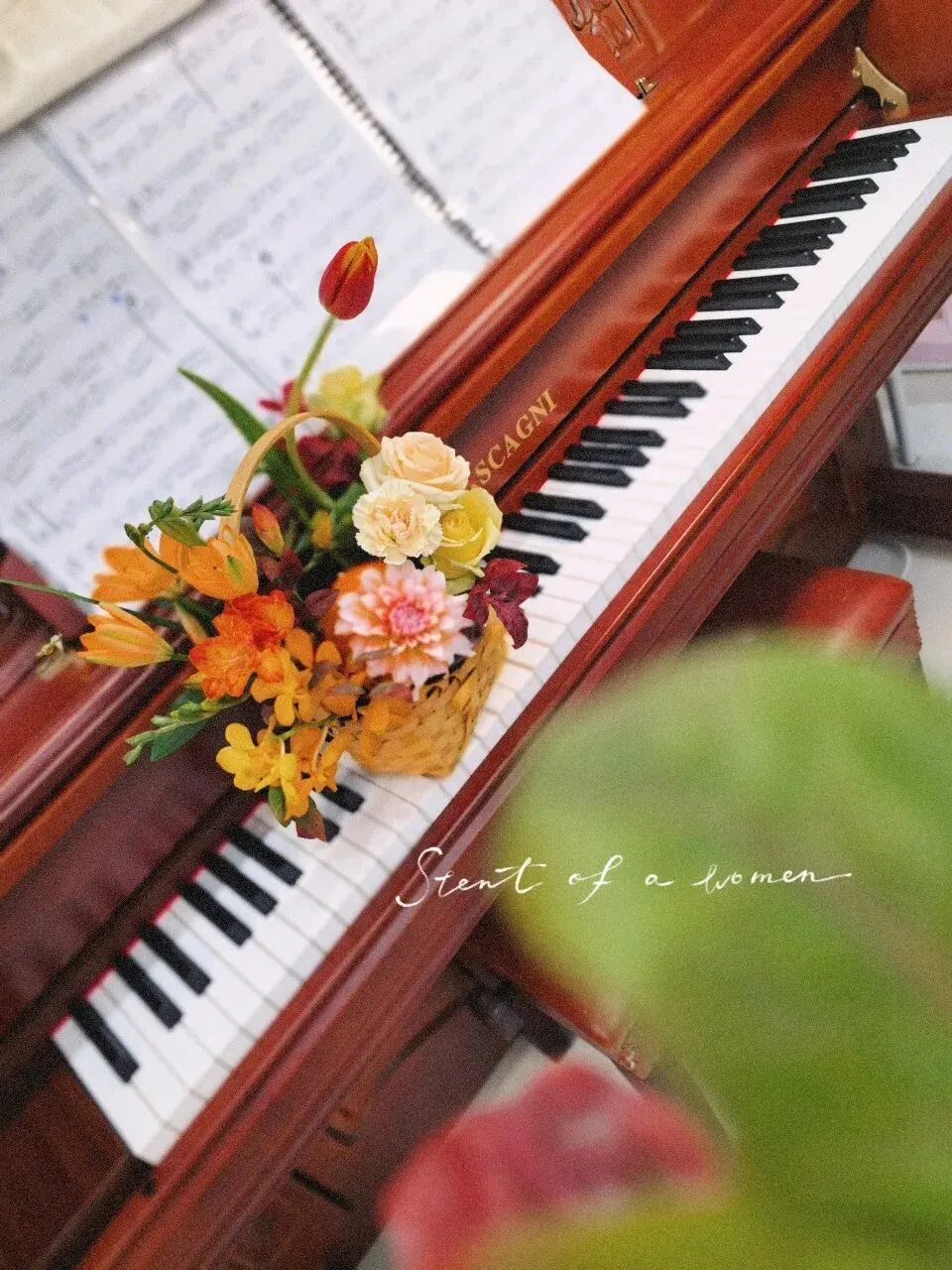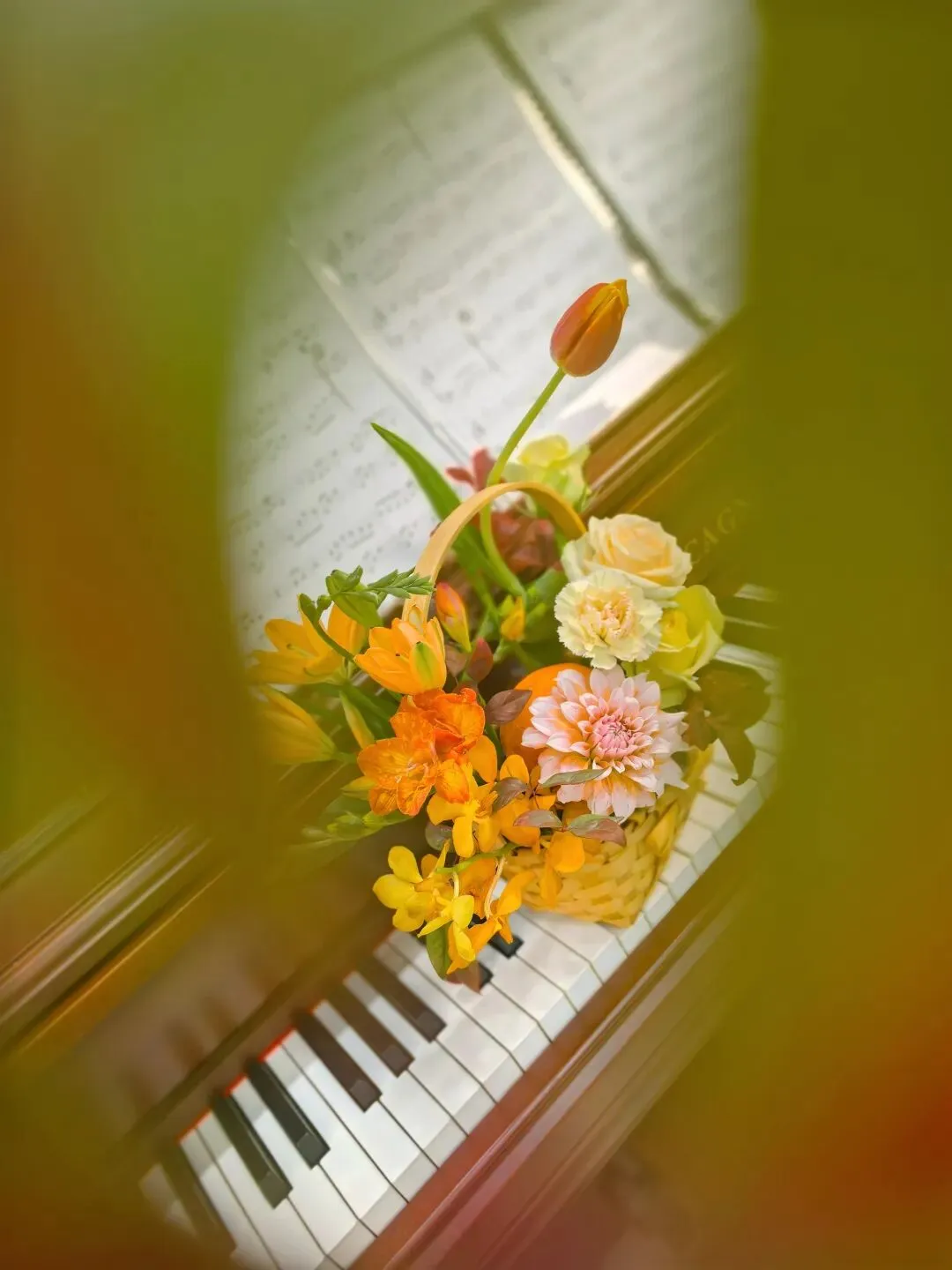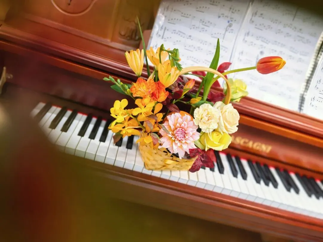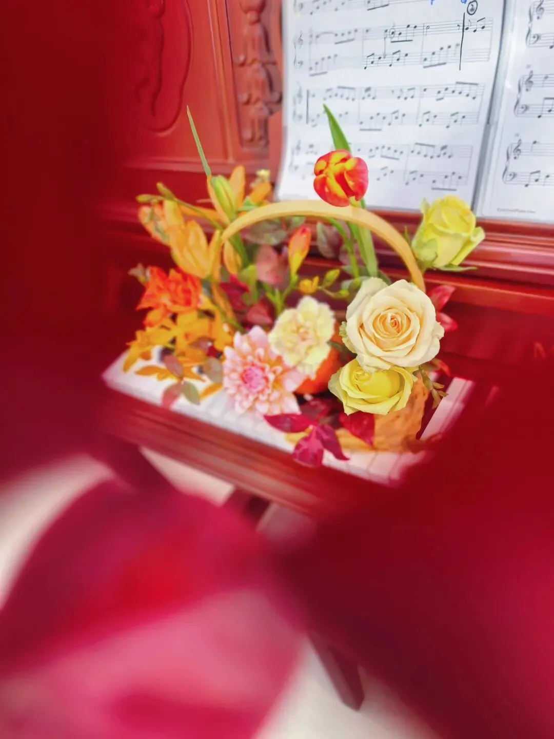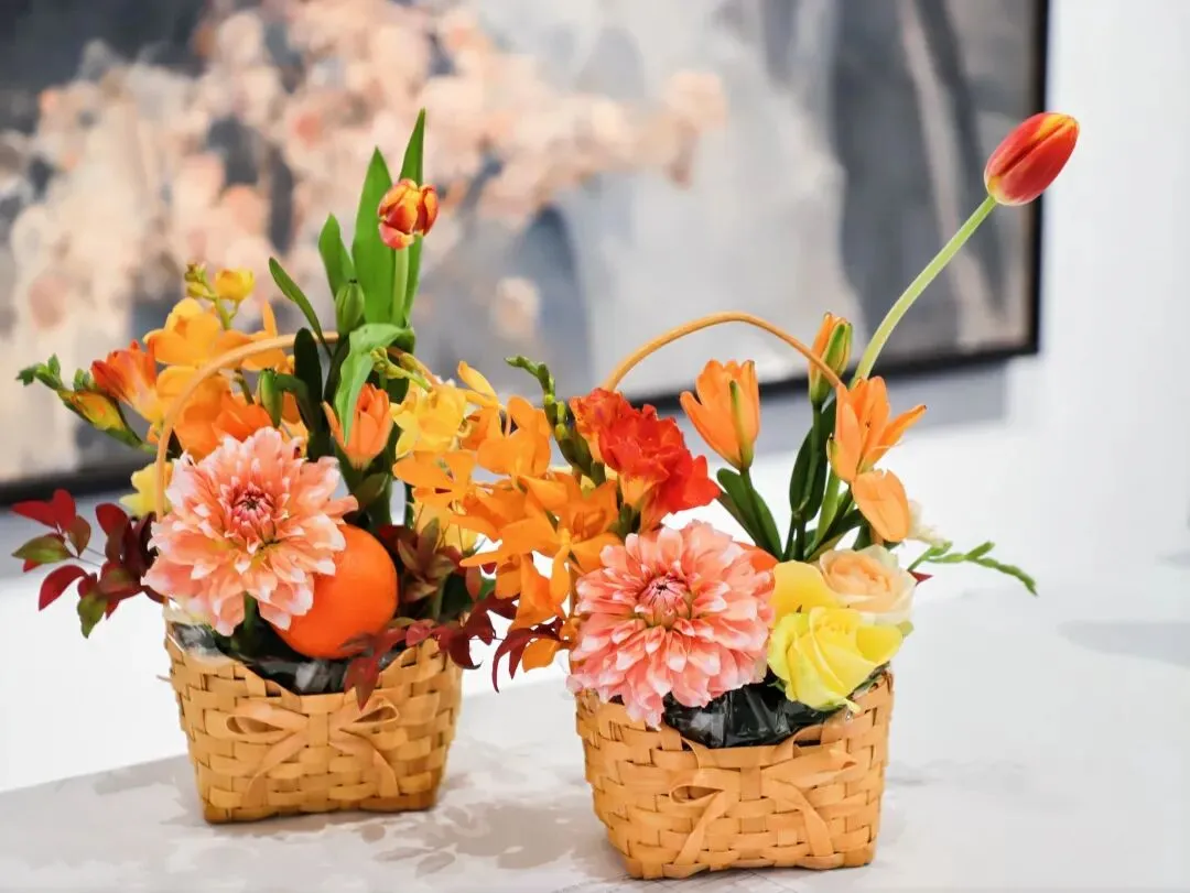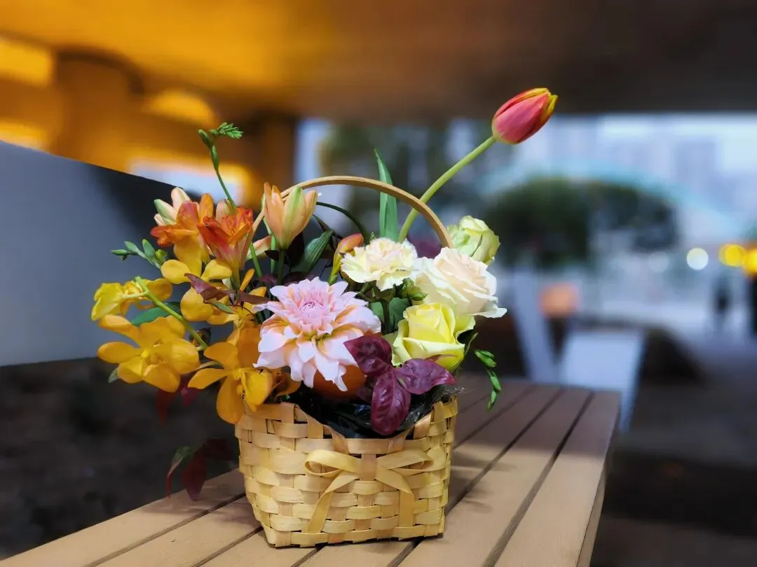 这是今天下午我自己插的花。橙红色的郁金香斜斜地倚着,深红渐变浅粉的大丽花在花篮稍左侧,几枝颜色各异的玫瑰从右侧的枝叶里探出头来,绿色红色的叶子错落地散开。