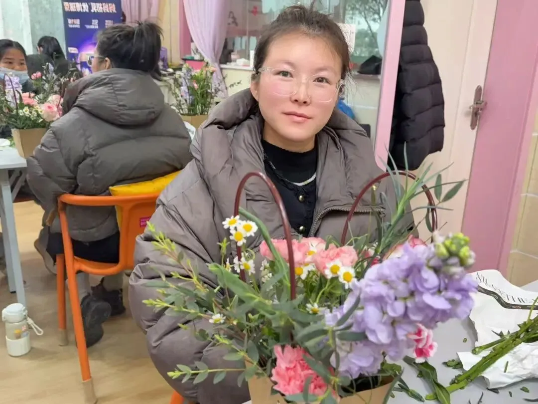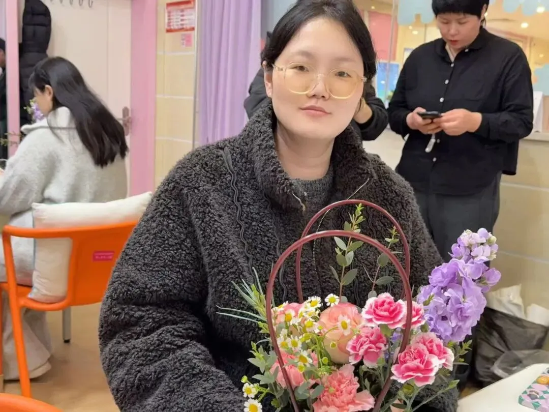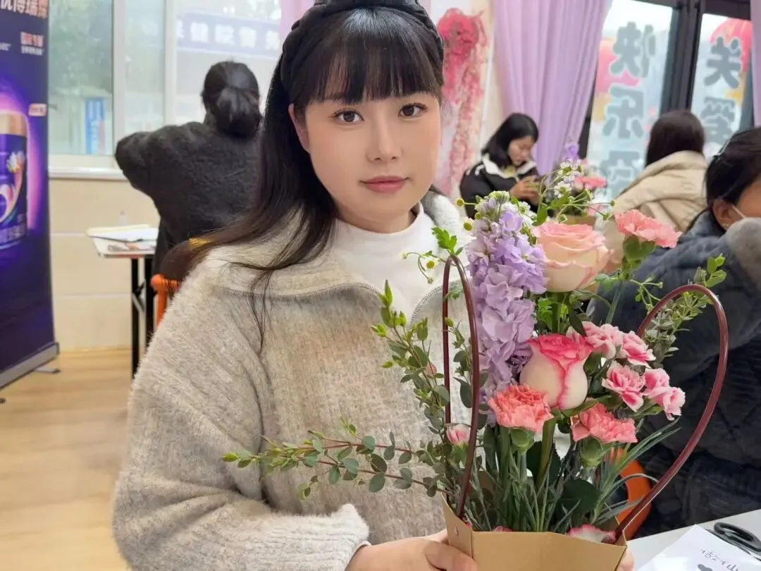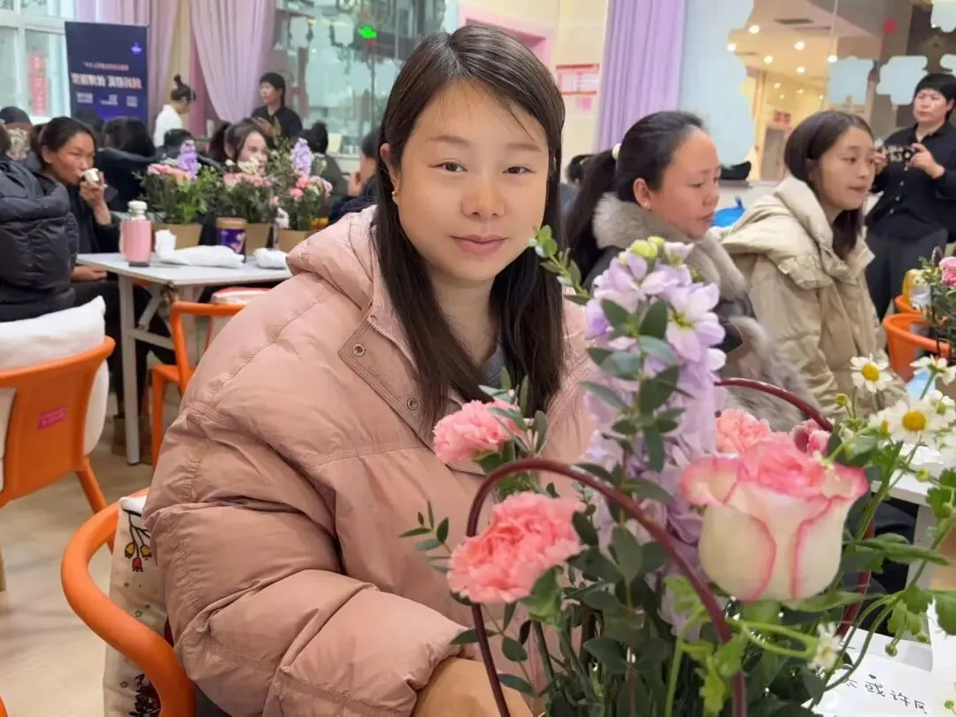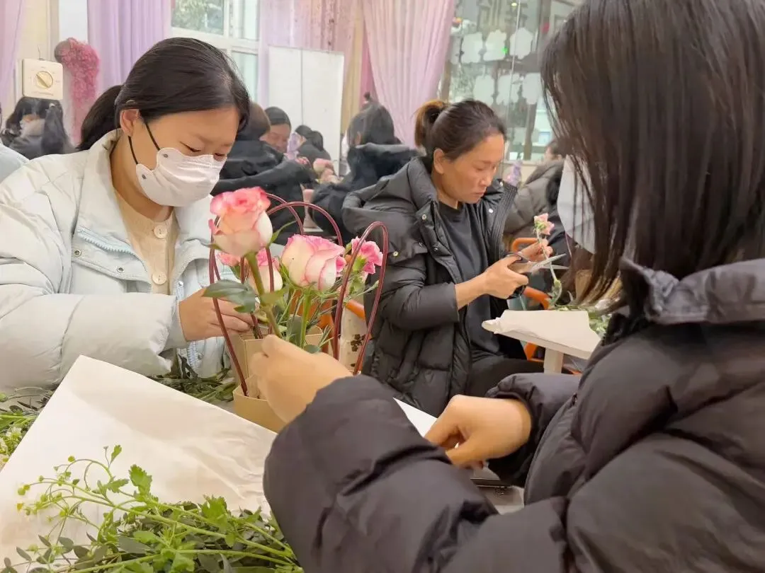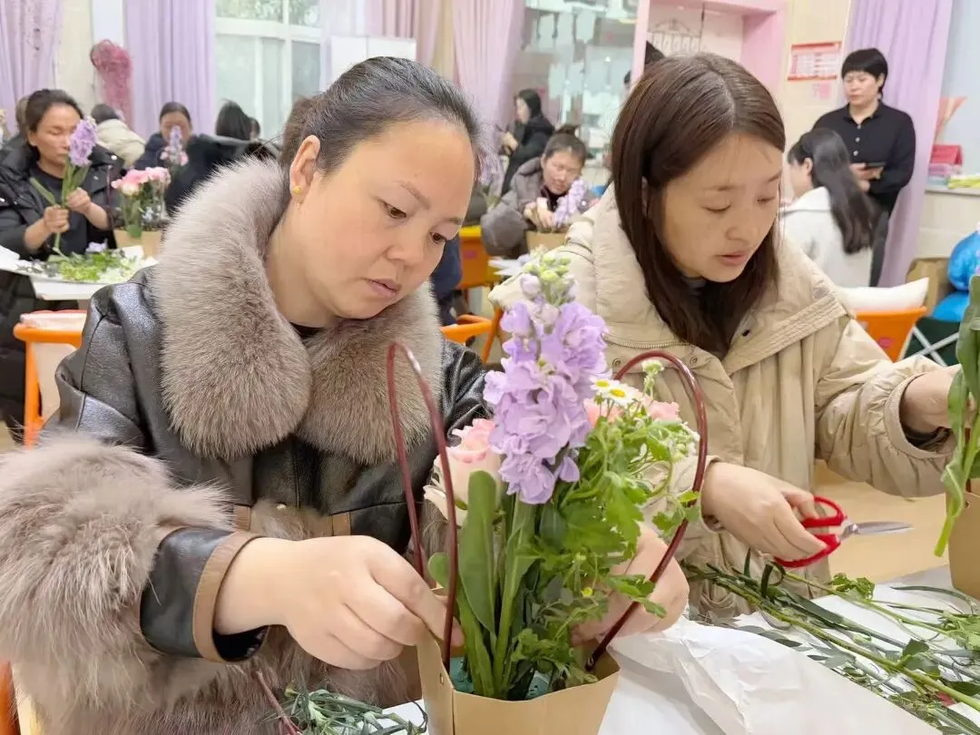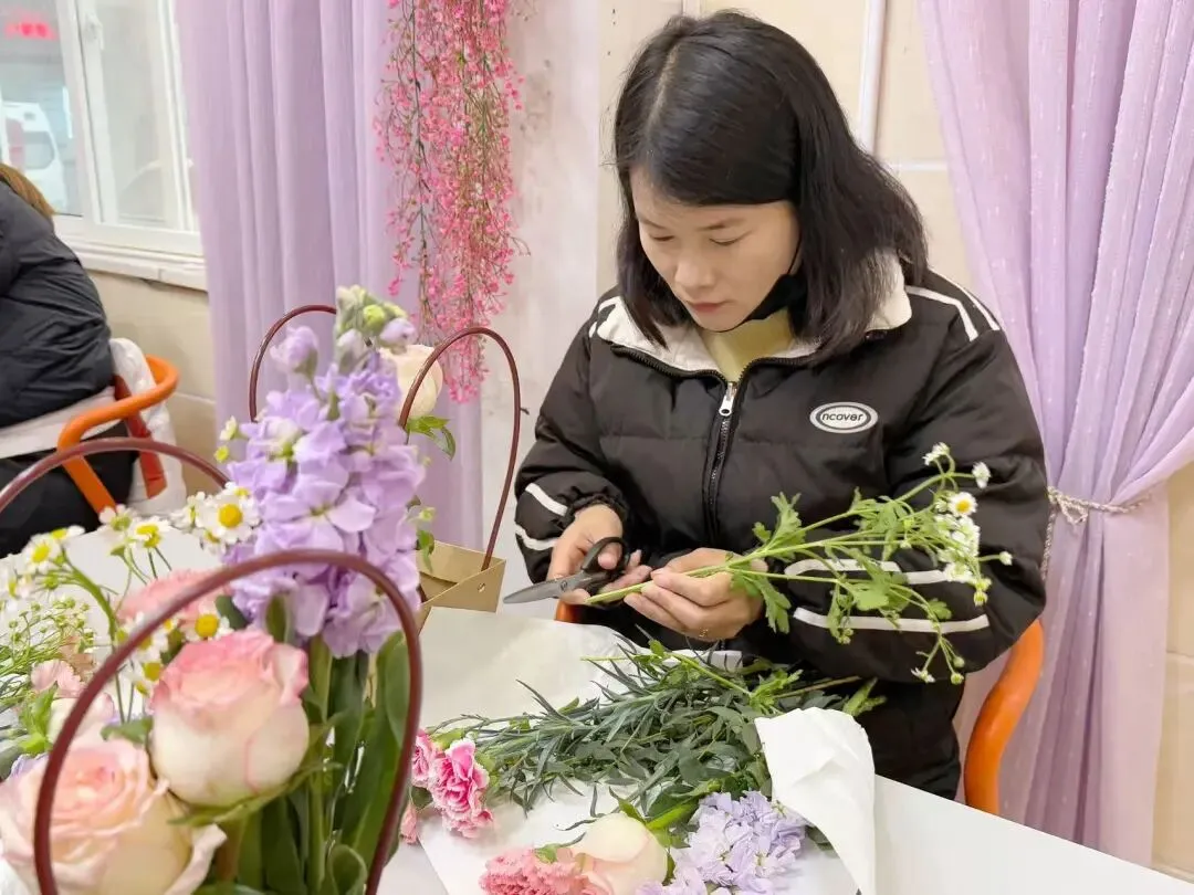 大家轻捏花茎、细剪枝叶,精心搭配每一朵花、每一片叶,将玫瑰的娇艳、康乃馨的温馨、洋桔梗的清新巧妙融合,在指尖勾勒出独属于自己的花艺作品。过程中,准妈妈们轻声交流孕期心得,分享孕育喜悦,欢声笑语与花香交织,定格下一段段温柔美好的瞬间。