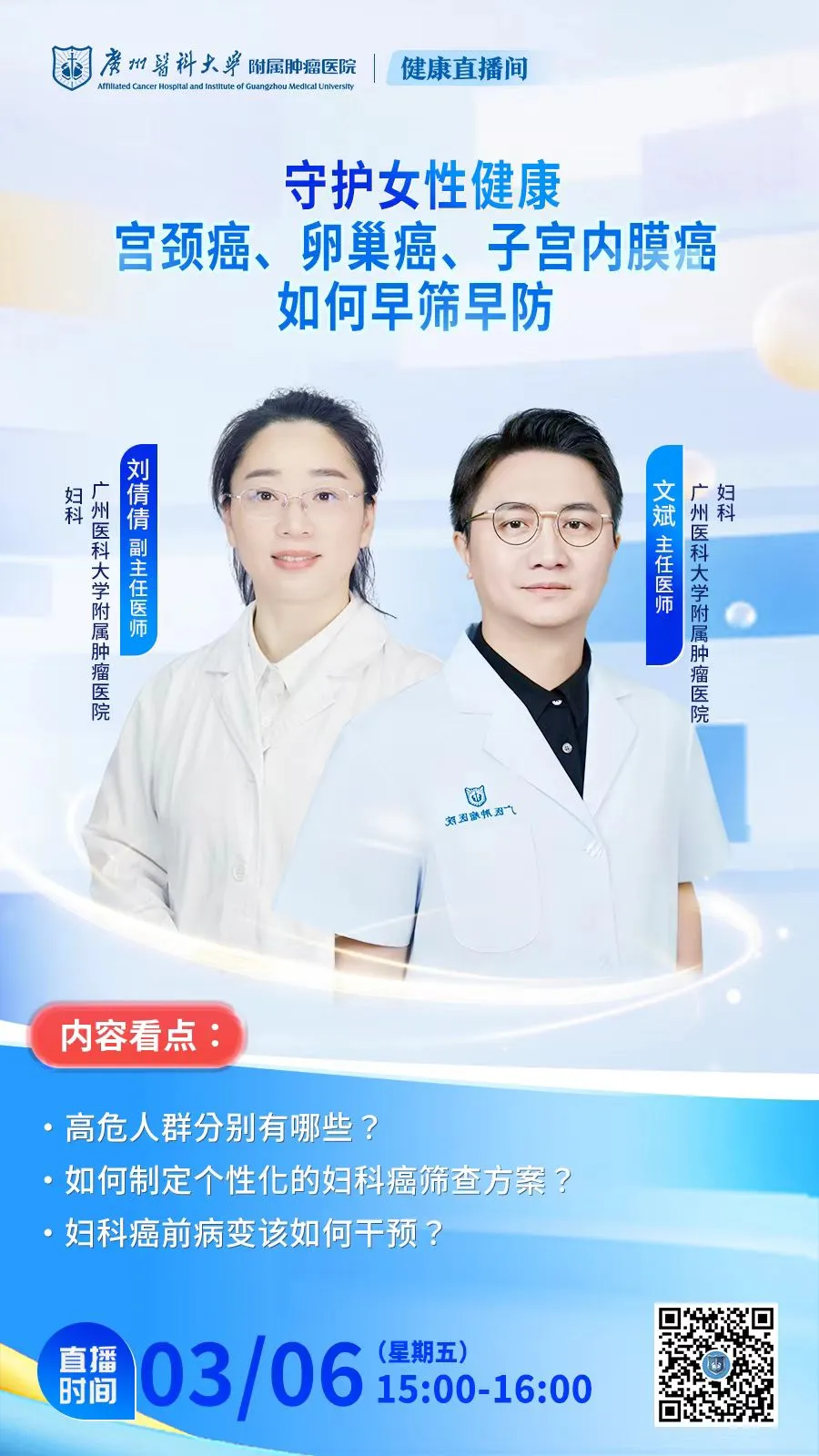 健康是最美的礼物,更是幸福的底气。为帮助女性朋友科学认识妇科肿瘤,掌握规范防治与康复知识,今日下午,我科文斌主任与刘倩倩副主任联袂坐镇,带来线上健康科普直播。用权威专业、通俗易懂的讲解,为大家解答疑惑、传递科学理念,用医者温度守护女性健康。