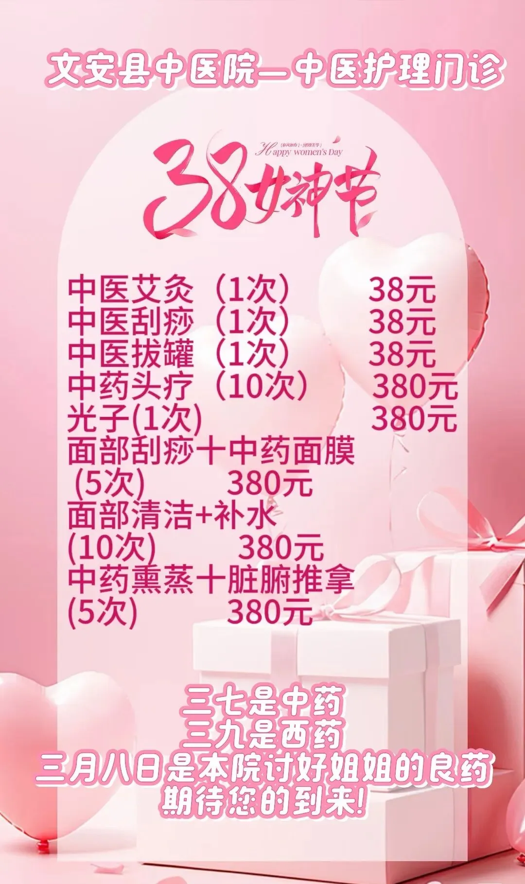 冬日渐远,春意初萌。新年的余温还未散尽,我们迎来了第117个“三八”国际妇节,为呵护广大女性朋友们的健康,助力美好生活,文安县中医院在本月特推出历年优惠活动,为广大女性同胞献上美好的祝福和专享的服务!