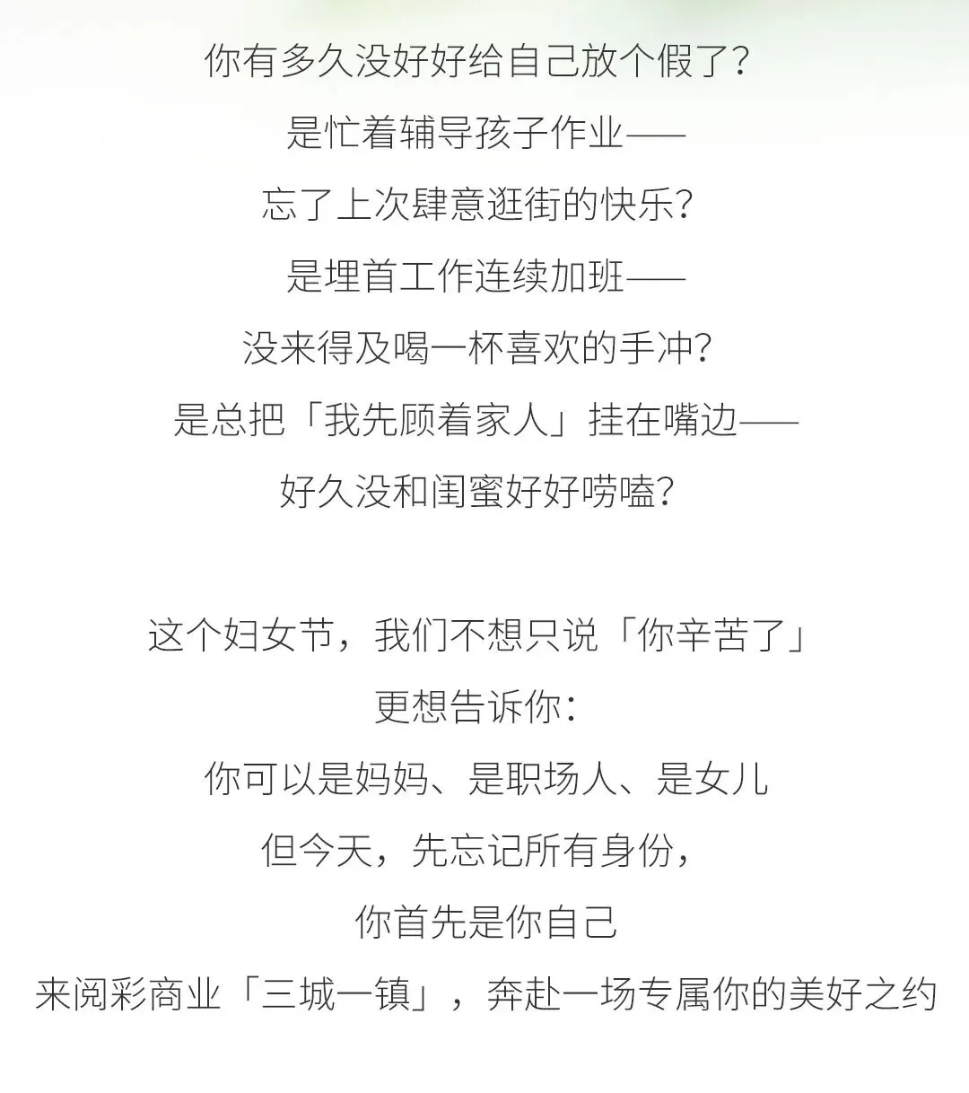 这个女神节,愿你在阅彩商业「三城一镇」,找到属于自己的美好与热爱。我们不祝你只在今日快乐,愿你岁岁年年,都能被温柔以待,永远热爱,永远闪耀,做自己的女神,光芒万丈!