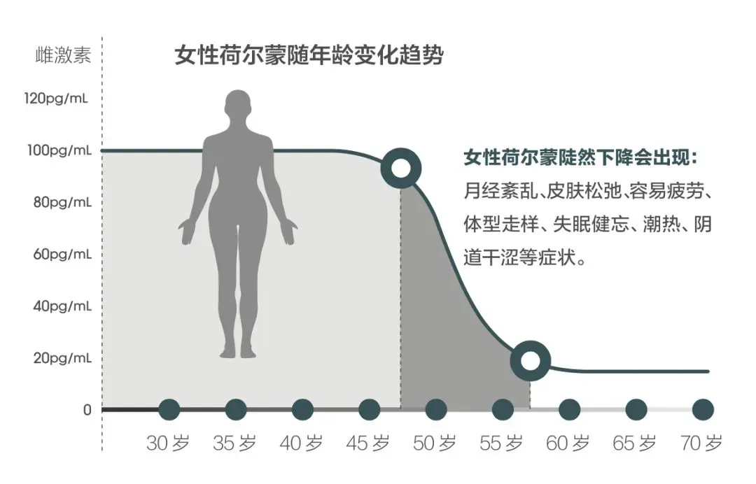 随着年龄增长,女性荷尔蒙水平逐渐下降,尤其是进入围绝经期和绝经期后,雌激素、孕激素等关键激素的减少会引发一系列健康问题,如潮热、失眠、骨质疏松、心血管疾病风险升高等。
