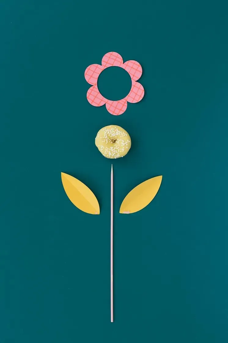 将甜甜圈插入竹棍中并固定在小花上