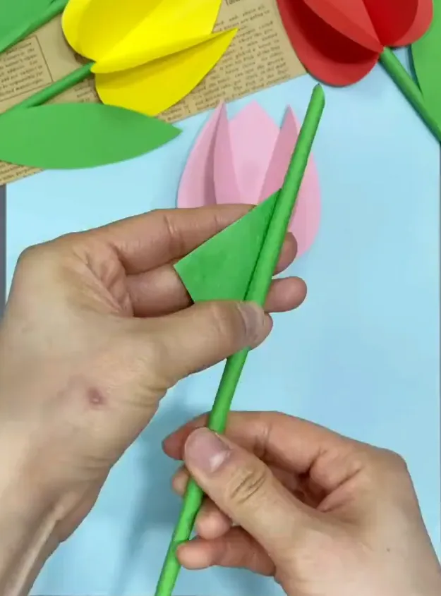 再继续用绿色的彩纸滚成花根的样式
