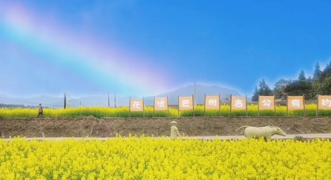 从花海出发,前往曾口镇吉公村,千亩油菜花如约盛开,金色花田一望无际,与村落、远山相映成画。漫步田埂,看蜂蝶飞舞,闻泥土与花香,沉浸式感受田园诗意。