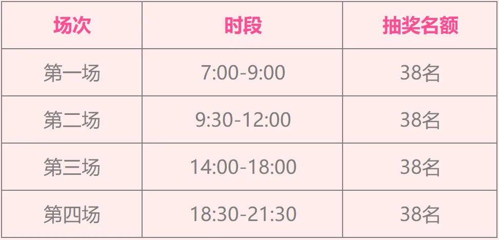抽奖名额:按场馆4个运营场次拆分,每场次前38名符合条件的顾客可参与抽奖,4场次总计152个名额,先到先得,抽完即止,具体分配如下: