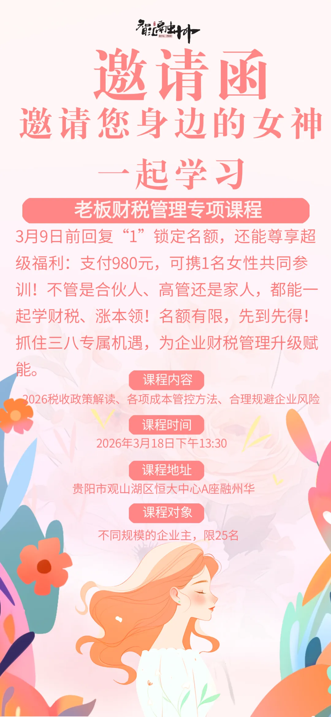 为了让这份福利更有温度,我们特别推出三八专属超级福利:‌3月9日前回复“1”锁定名额,支付980元,您可携1名女性共同参训‌!不管是您的事业合伙人、核心高管,还是家人,都能一起走进课堂,学财税、涨本领,共同为企业发展蓄力。