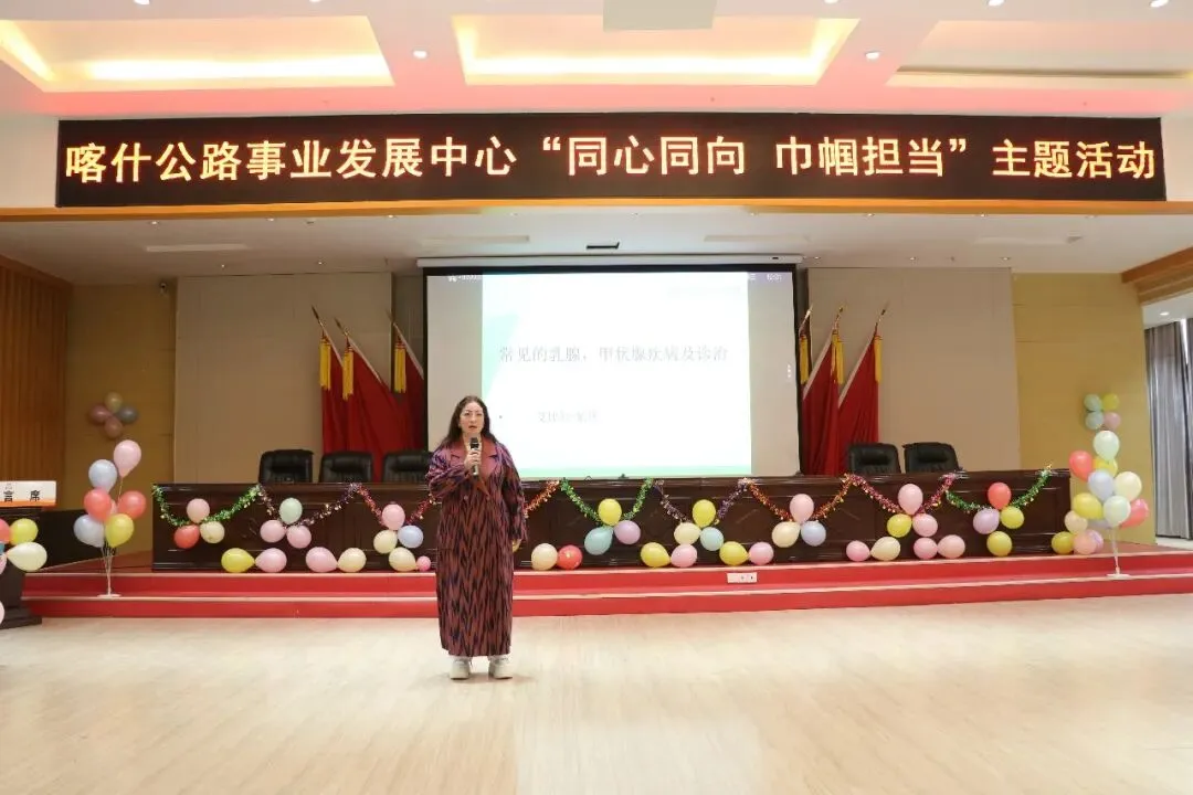 阳春三月,桃李芬芳。在第116个“三八”国际妇女节来临之际,为切实关爱女职工身心健康,普及科学的女性健康知识,增强女职工自我保健意识,3月6日,疏附县人民医院甲乳外科主任、银龄专家艾比拜·依明,妇产科主治医师杨林霞受邀前往喀什公路事业发展中心,开展“关爱女性健康·绽放巾帼风采”主题健康知识讲座,为全体女职工送上一份特殊的“健康大礼”。
