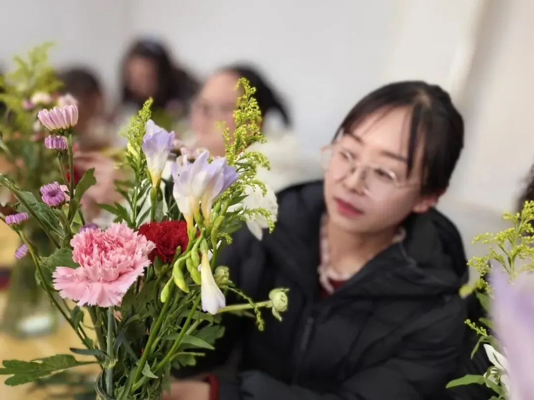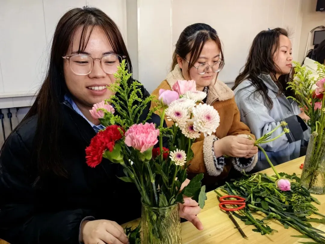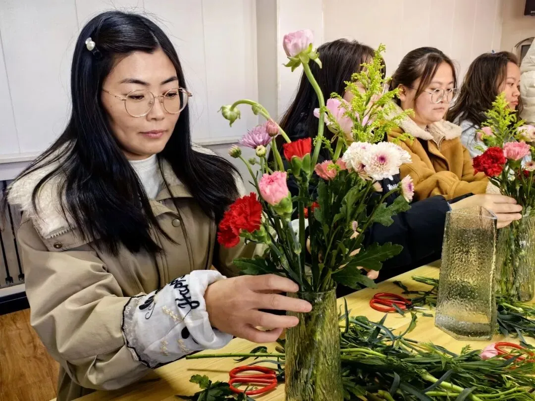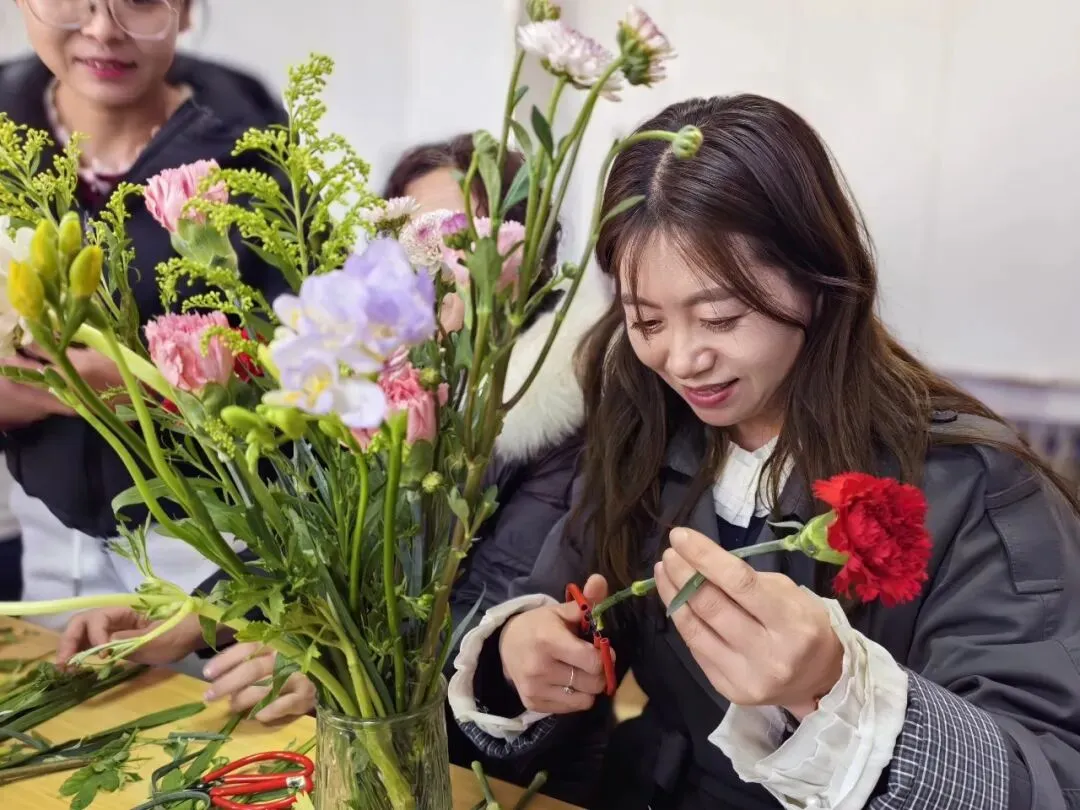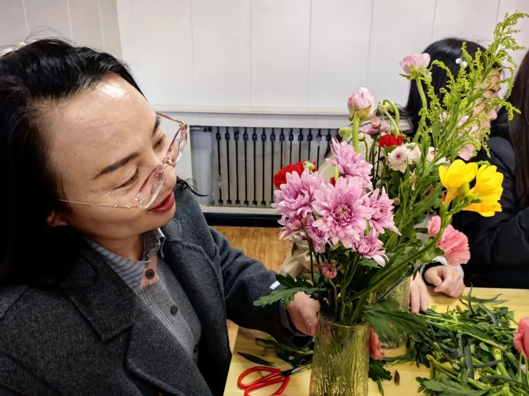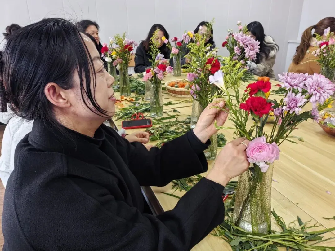 致辞环节结束后,活动迎来了高潮——自由插花环节。由妇联工作室李芳芳老师为女教职工们讲解花艺知识与插花技能,让女教职工在活动中加以实践运用,纷纷化身心灵手巧的艺术家,精心修剪手中的花材,巧妙地进行搭配组合。不一会儿,一捧捧独具匠心、色彩明艳的插花作品诞生了。