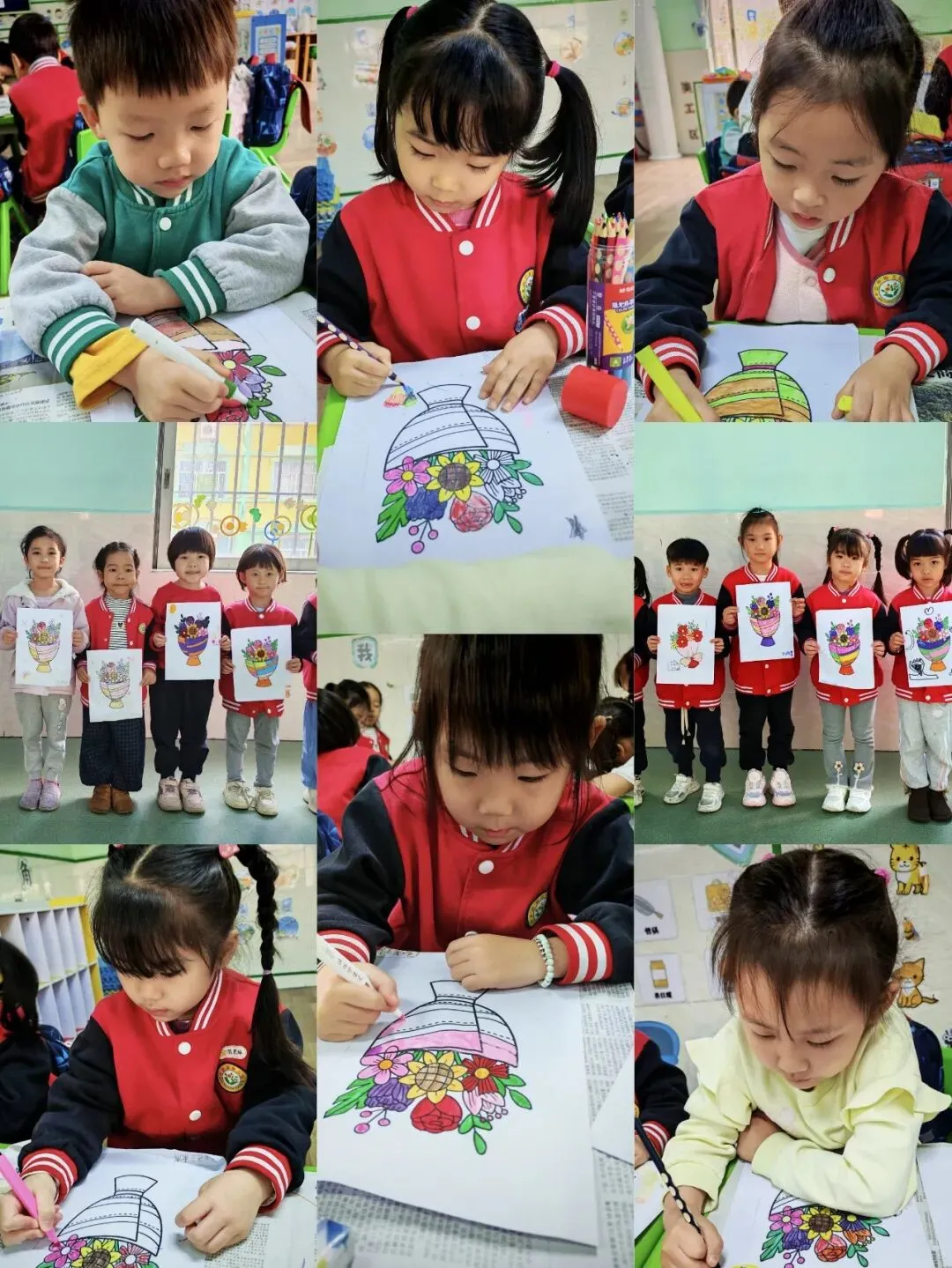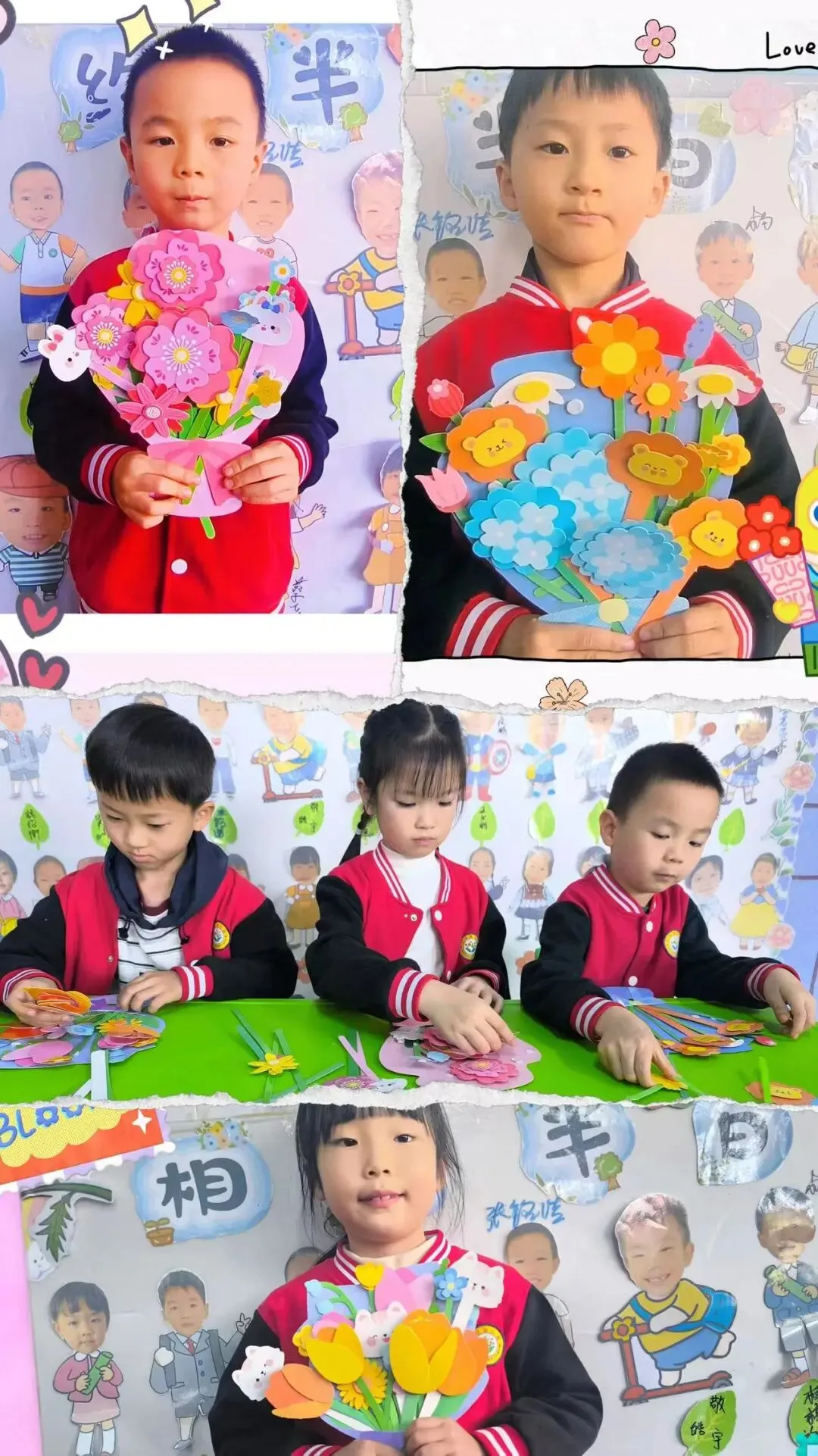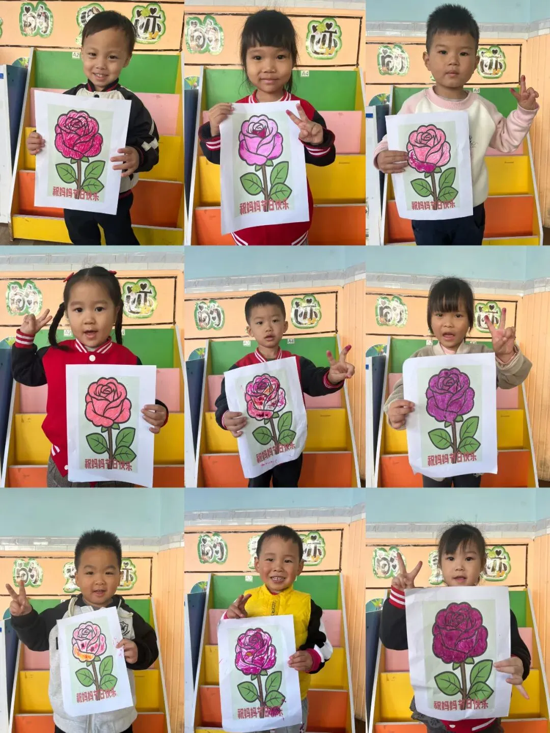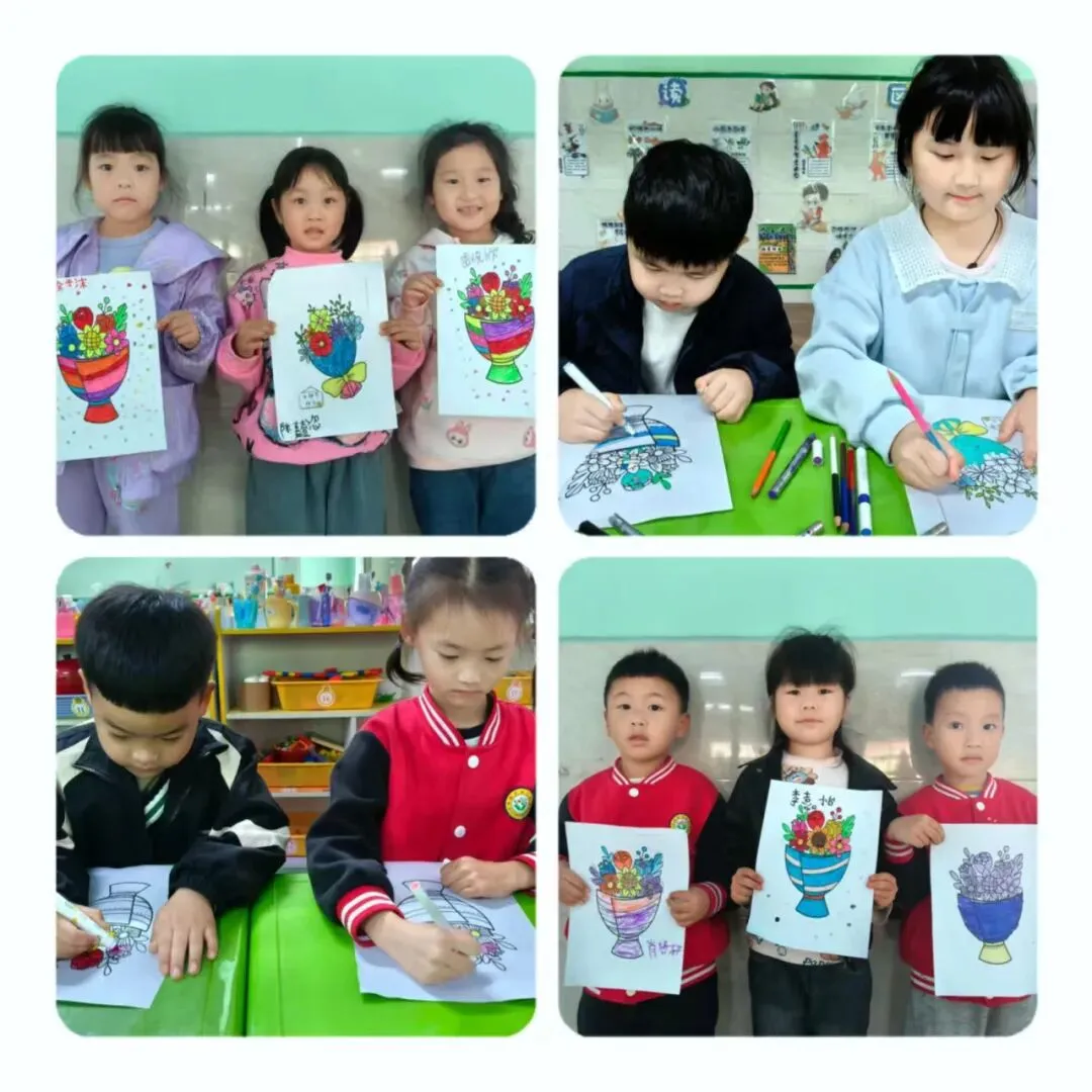 宝贝们用彩纸、棉棒头和颜料等简单材料,亲手拓印绘画出一朵朵鲜艳的玫瑰花,并将它们巧妙地组合成漂亮的花束,以此向辛勤的妈妈和老师表达感激之情。