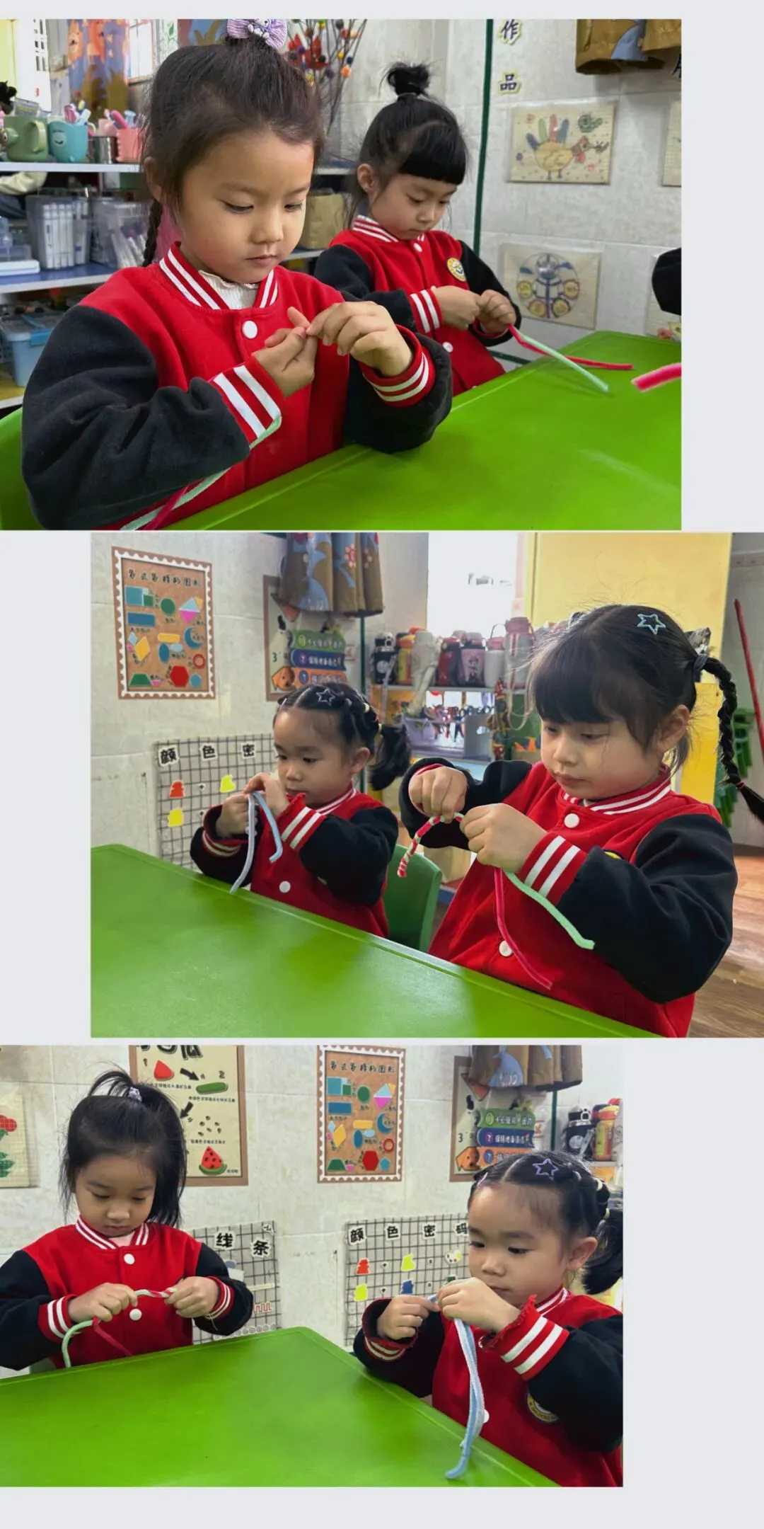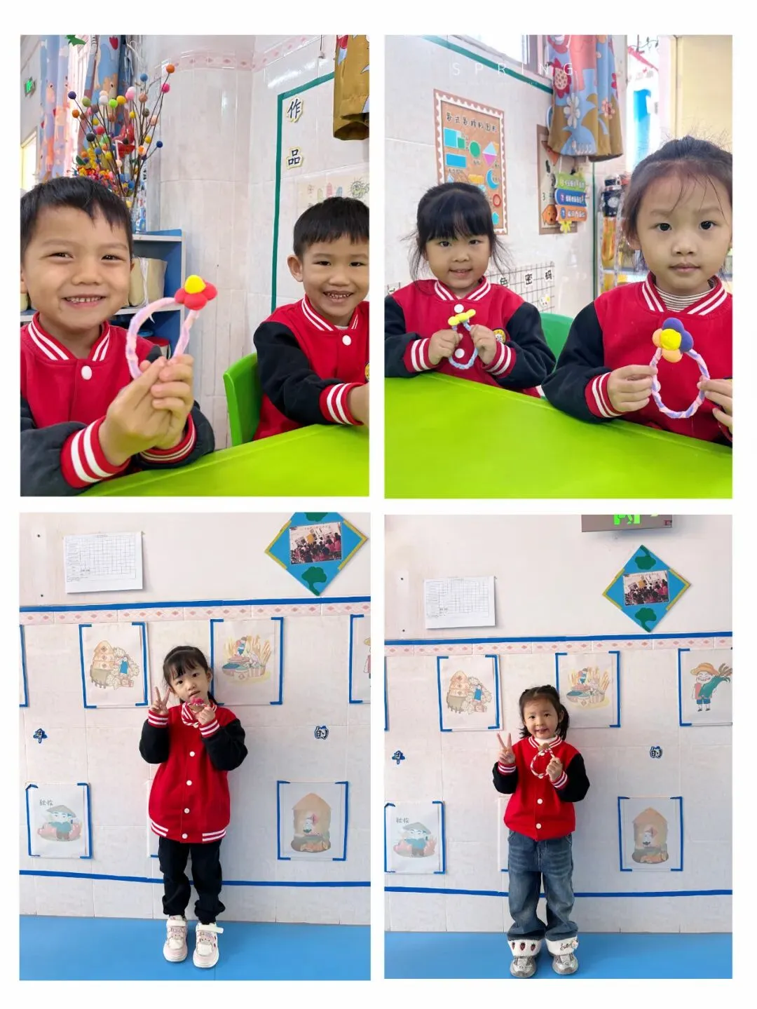 宝贝们利用扭扭棒、彩虹盘、颜料、画笔等简单的材料,运用自己灵巧的双手,制作出一个个精美的手工作品,以此来表达对老师们和妈妈的祝福!