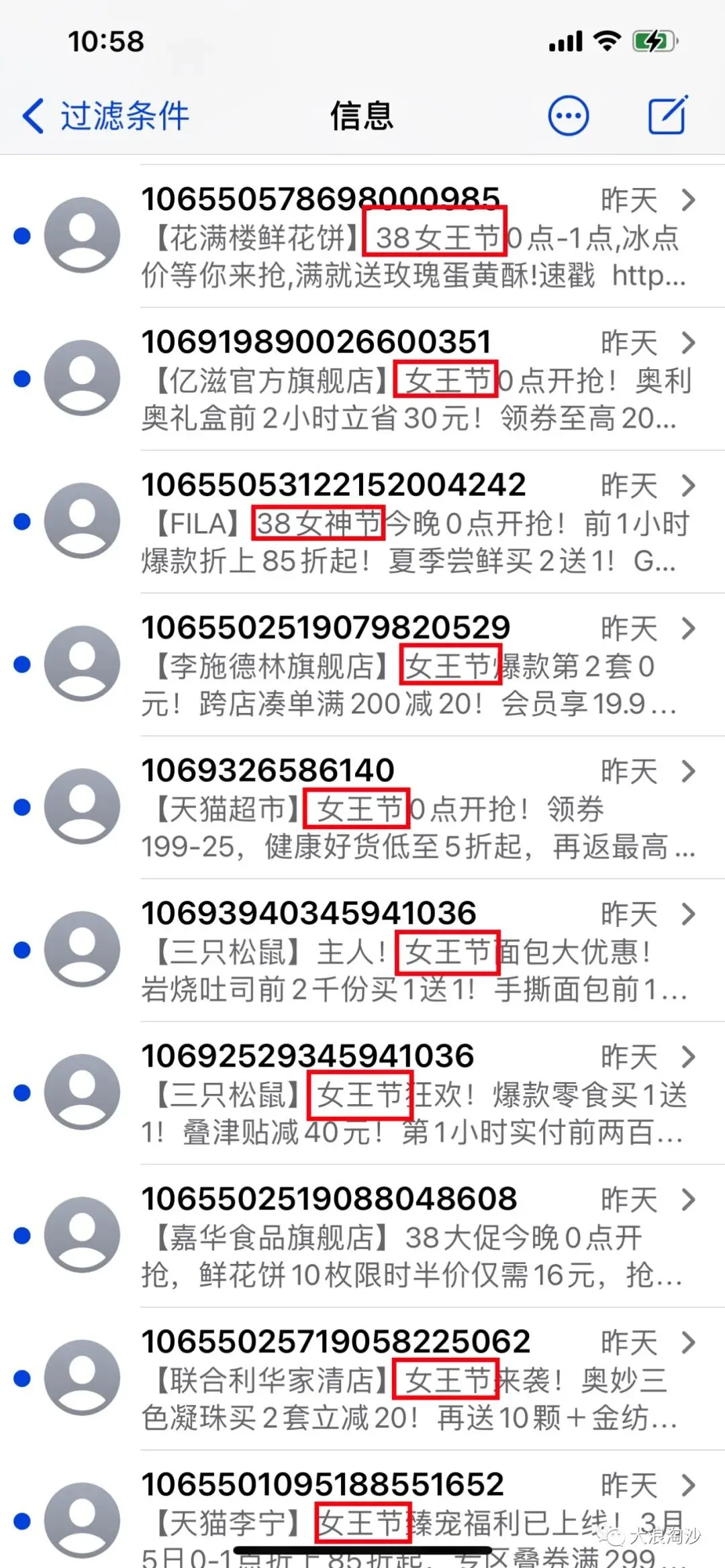 看今年各大品牌搞促销滥发的短信,我手机随便截一张图就是这样的画风: