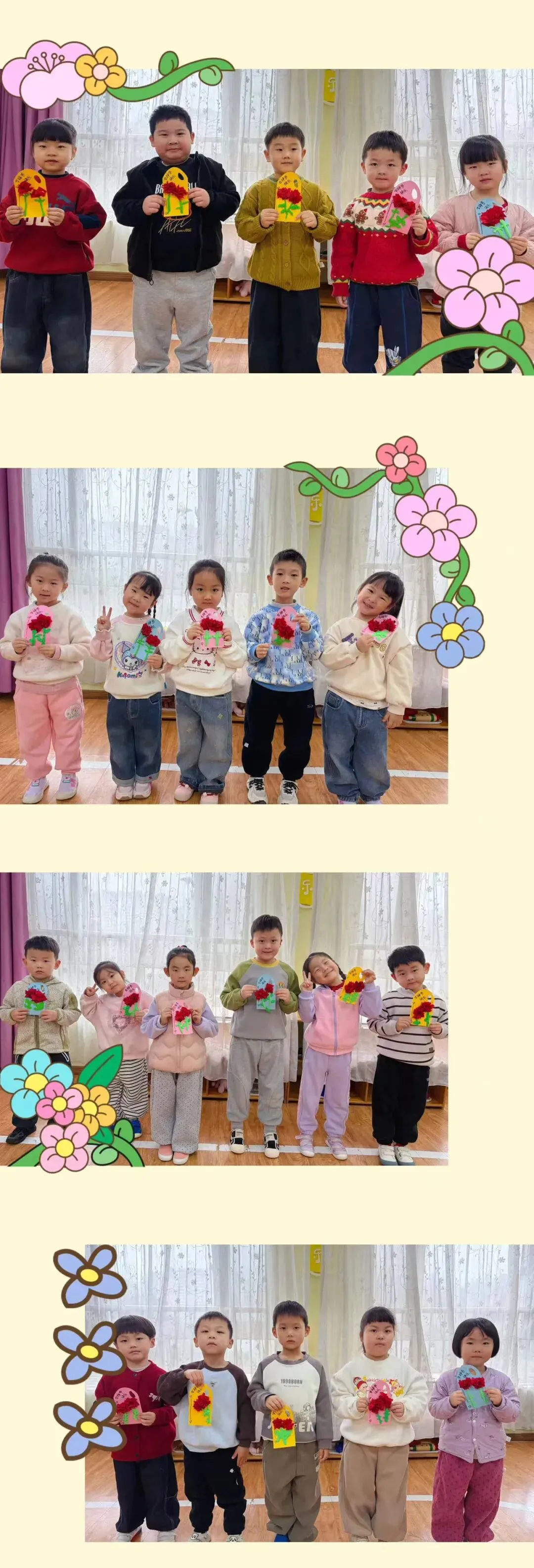 几盒黏土,一张彩纸,孩子们细心揉搓,精心地包扎,就变成了一束束美丽的花朵,孩子们用最真诚的心,做感恩的礼物,送给他们心目中的女神!