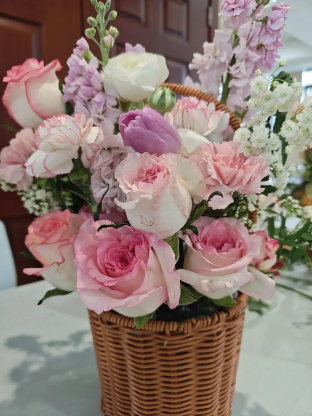 请老师来评看,老师夸赞说层次感很好。我这是沾了花儿的光了,粉紫色系的花本来就好看。