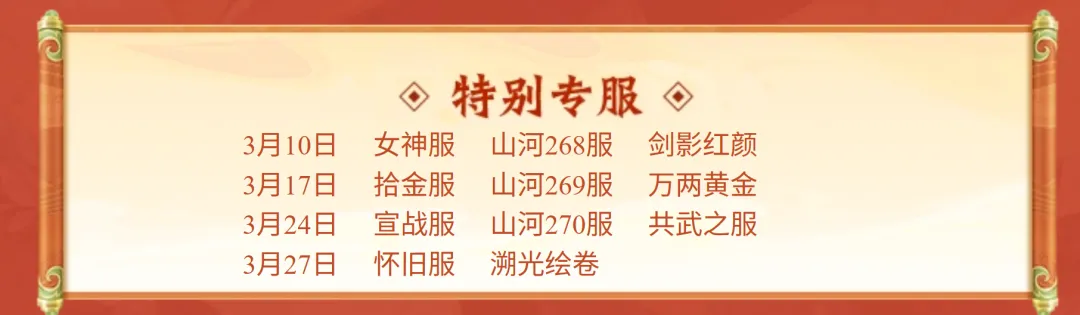 三月期间将陆续开放四大特色专服,最近有入驻新服想法的少侠可以预约一下!