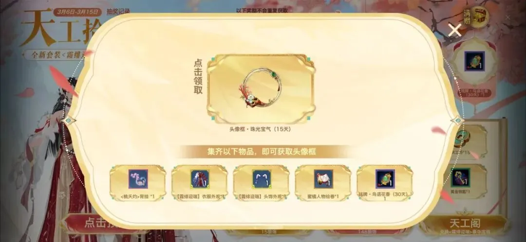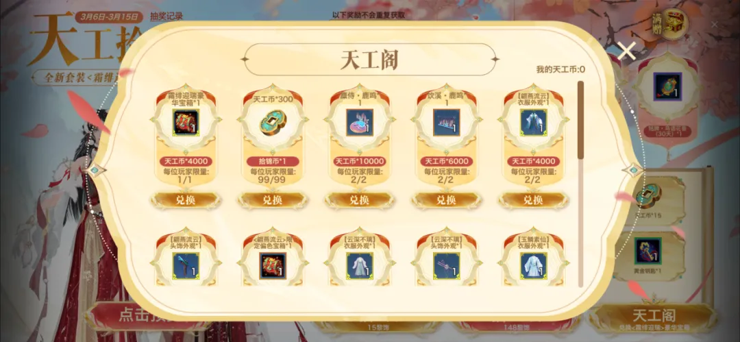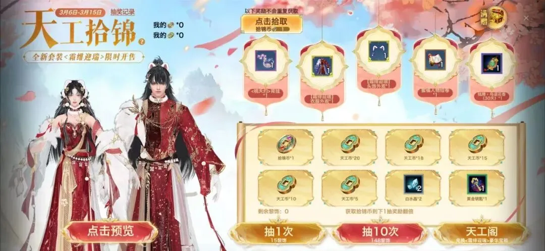 3月6日至3月15日期间,少侠们在游戏内参与【天工拾锦】活动,有机会获得各类精美奖励以及全新主题外装【霜绯迎瑞】