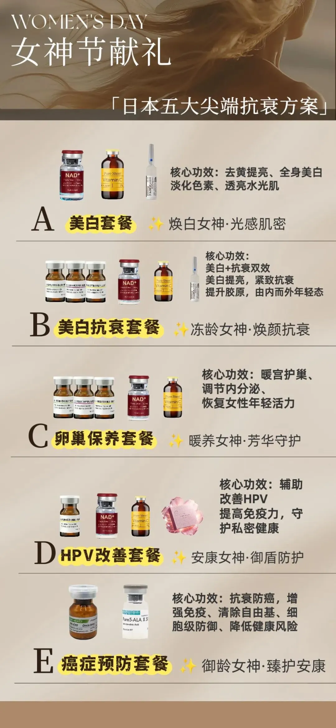 • 核心成分:NAD+、高浓度VC、女性专属干细胞制剂