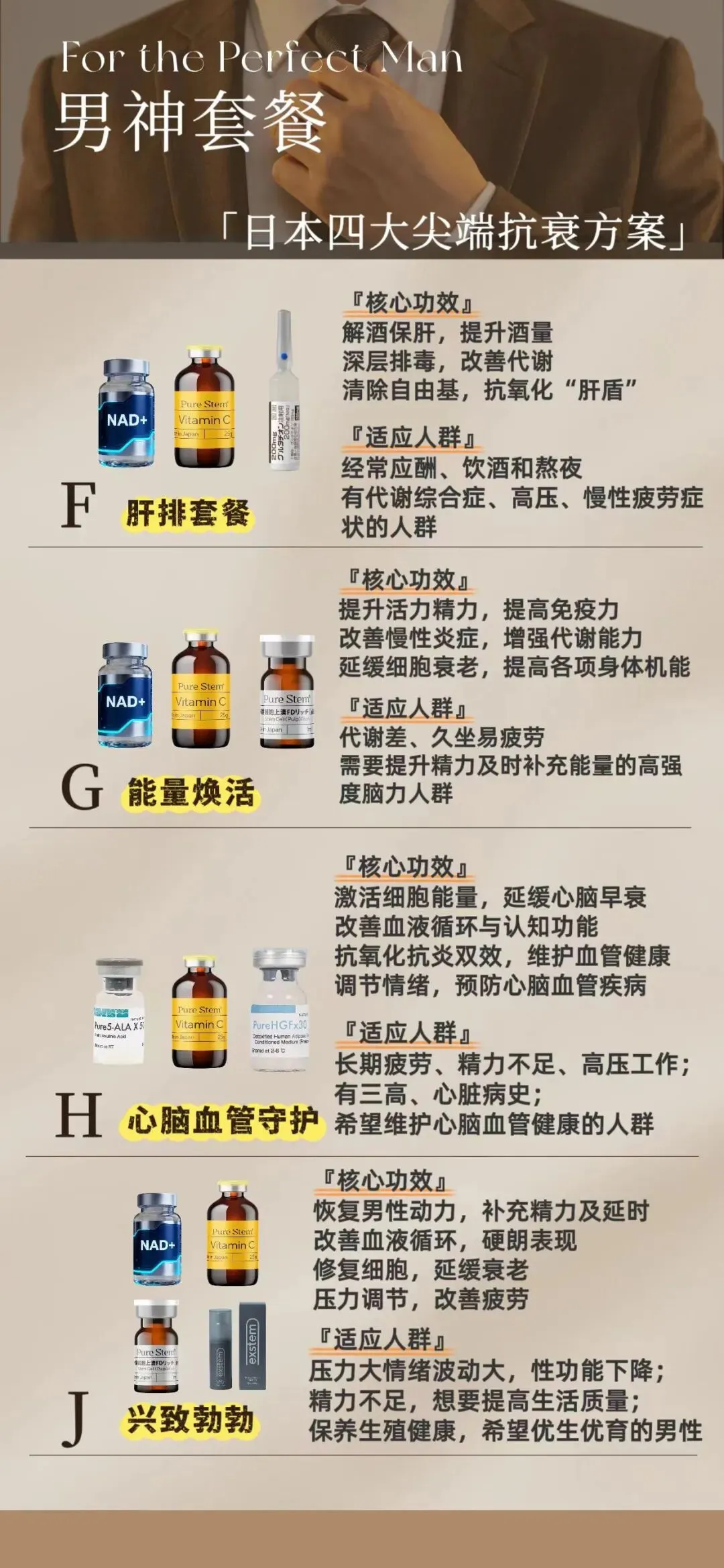 • 核心成分:NAD+、高浓度VC、男性健康干细胞制剂