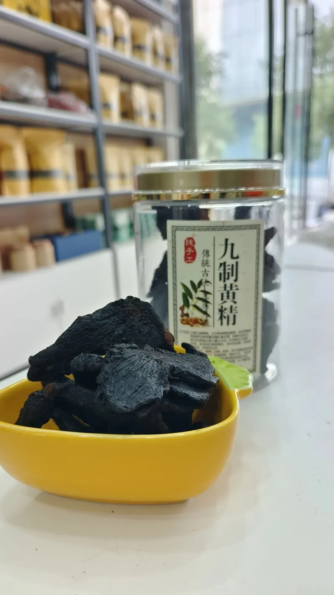 做出来的黄精,黑如漆、亮如油,切开油润拉丝,是时间沉淀出来的精华。