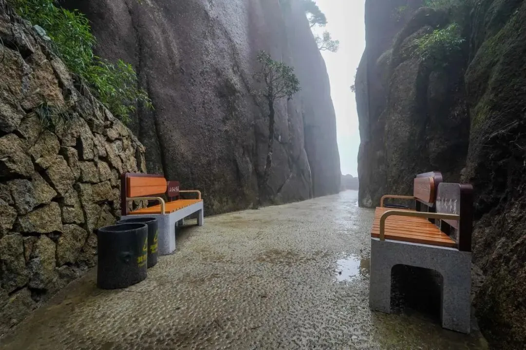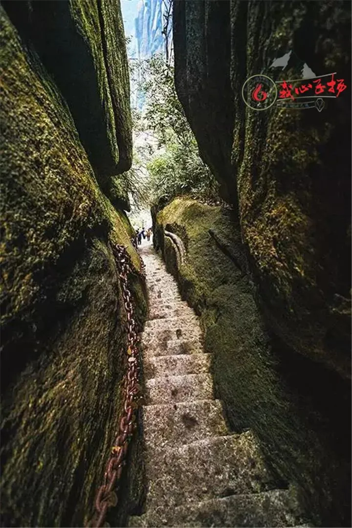 三清山一线天位于南清园景区石阶游步道往玉台(东)方向拐弯处,陡坡而上,两边悬崖如削,中间宽不足1米,斜坡长120米,高约百米,最窄处仅容1人通过,游人至此,抬头只见一线碧空,故名一线天。