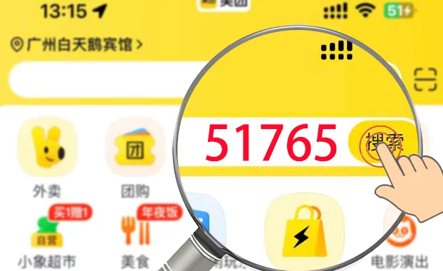 美团app首页搜索“51765” → 进入综合/美妆专场