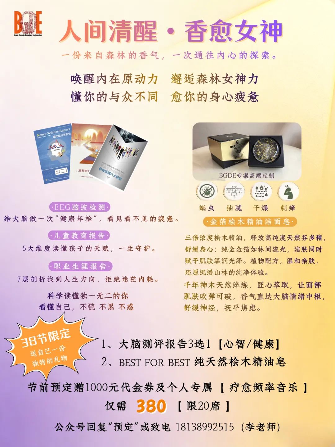 【“3·8”女神节福利!】380元(原价1380元),尽享:大脑测评“三选一”&“金箔桧木精油洁面皂”