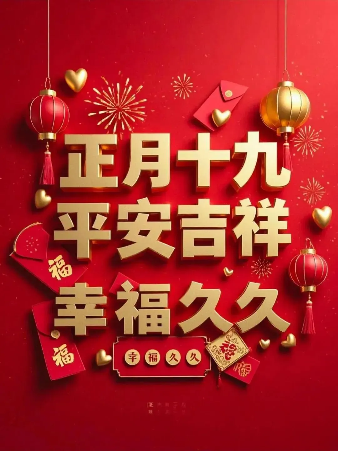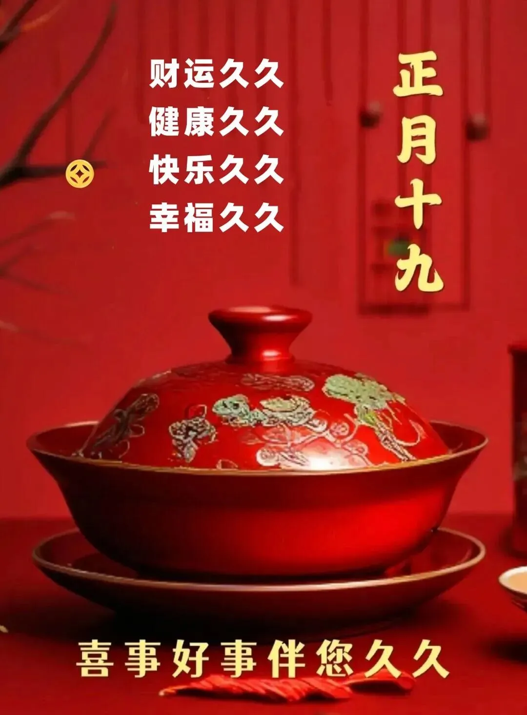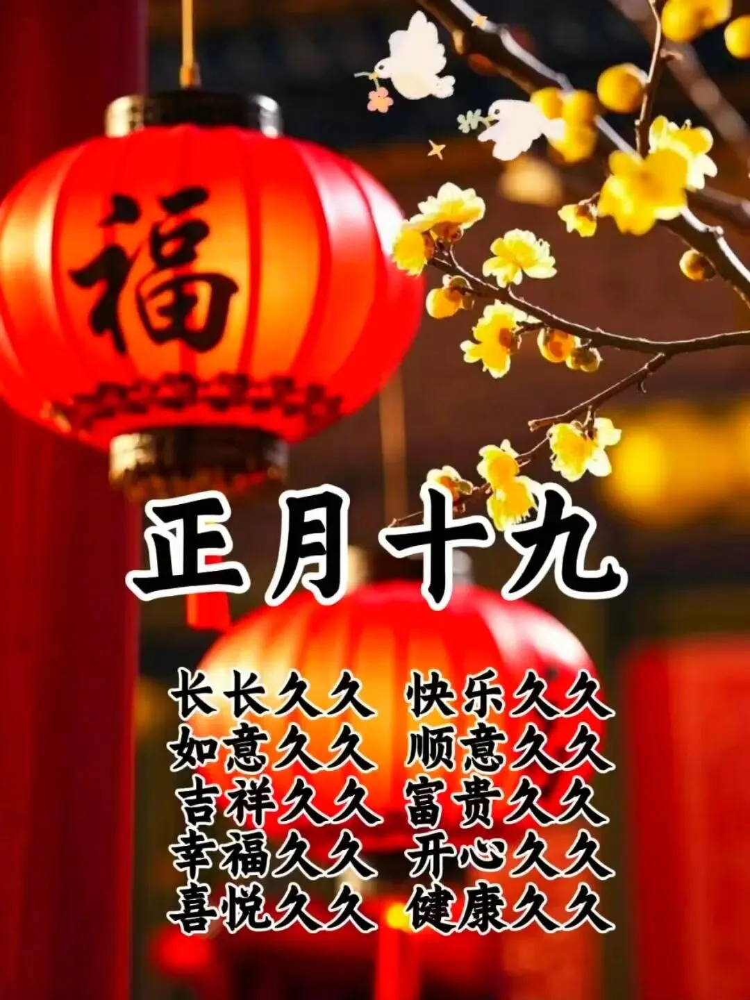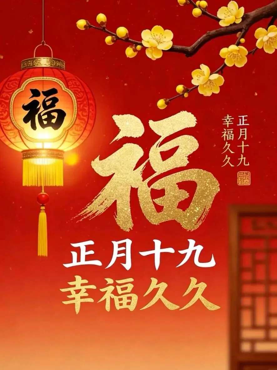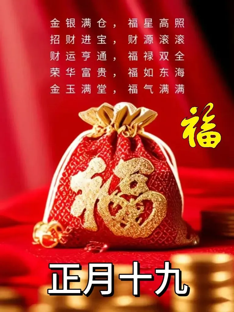 正月十九,幸福满溢人间春。欢声笑语暖心田,团圆幸福乐无边。福禄寿喜齐天降,好运连连喜临门。心想事成如愿望,幸福安康久久存。祝你青春如花,笑逐颜开,快乐永驻,幸福美满,福禄双全。🌹❤️☕️🎉🙏