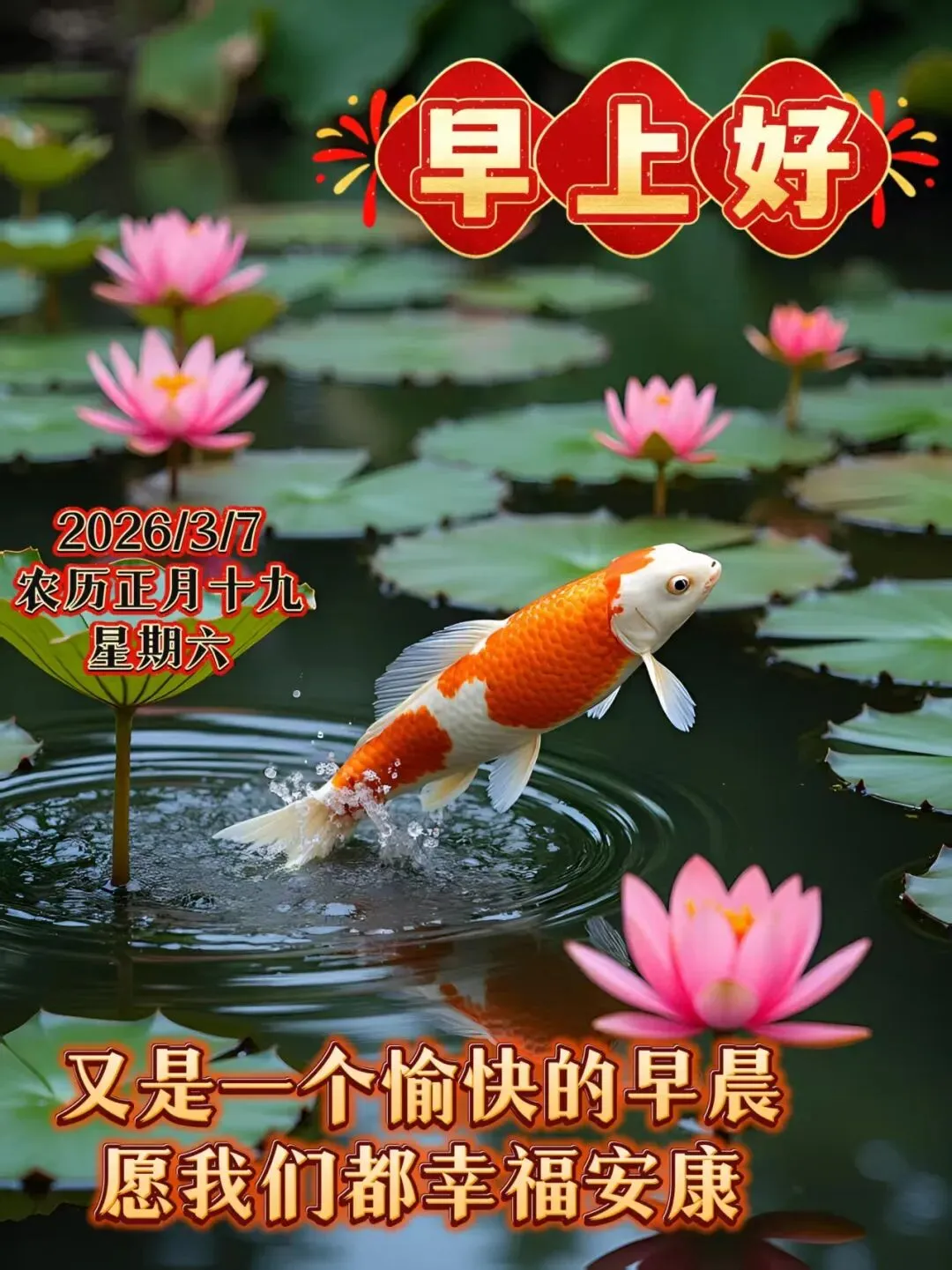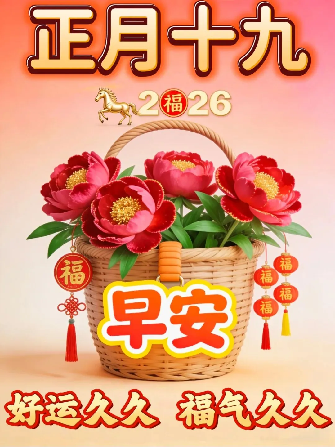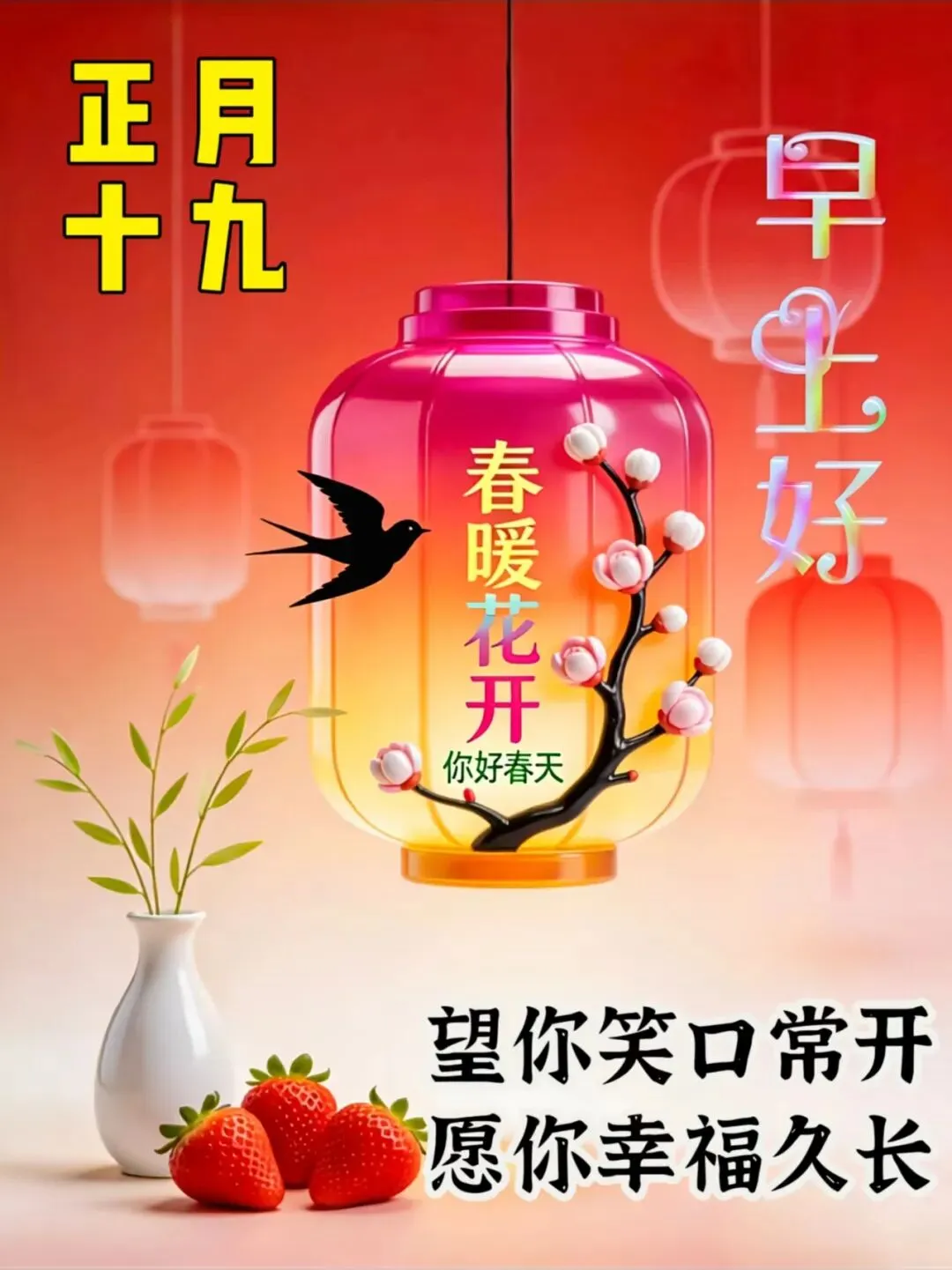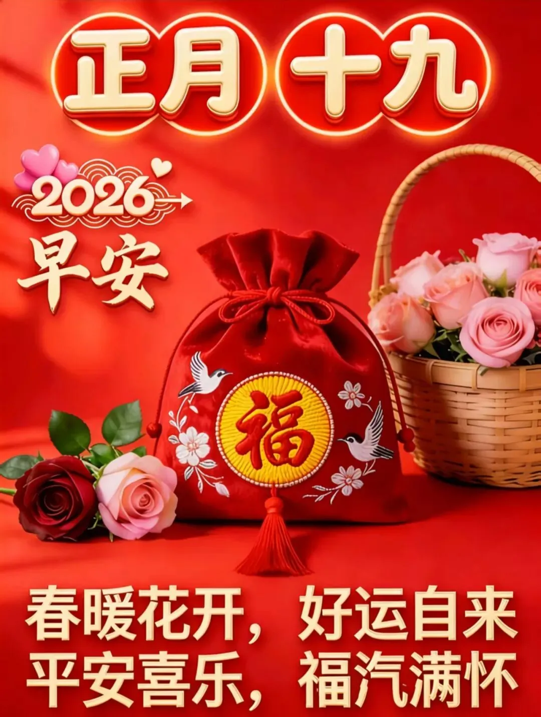 🧡🌈🌺正月十九早安到,祝福满满如春风。恭喜发财,财源广进;健康长寿,福寿绵长;吉祥如意,好运连连。喜气洋洋,甜蜜如蜜桃。望你笑口常开,愿你幸福久长。早安,朋友!🌸🌊💐