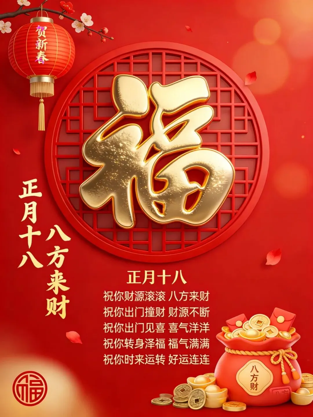 正月十八祝您一帆风顺、两全其美、三羊开泰、四季平安、五福临门、六六大顺、七星高照、八面聚财、九九安康、十全十美、百事可乐、千事吉祥、万事如意!