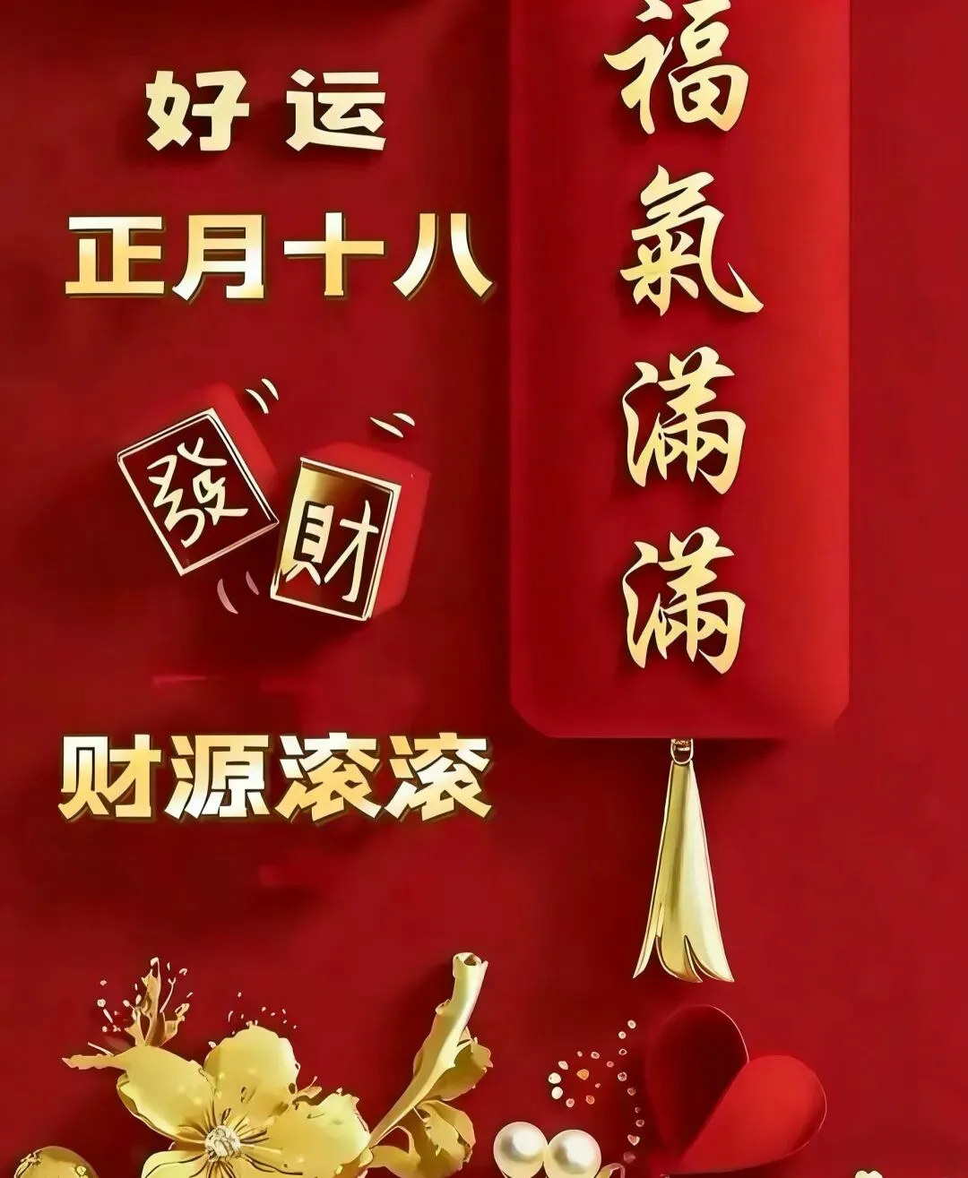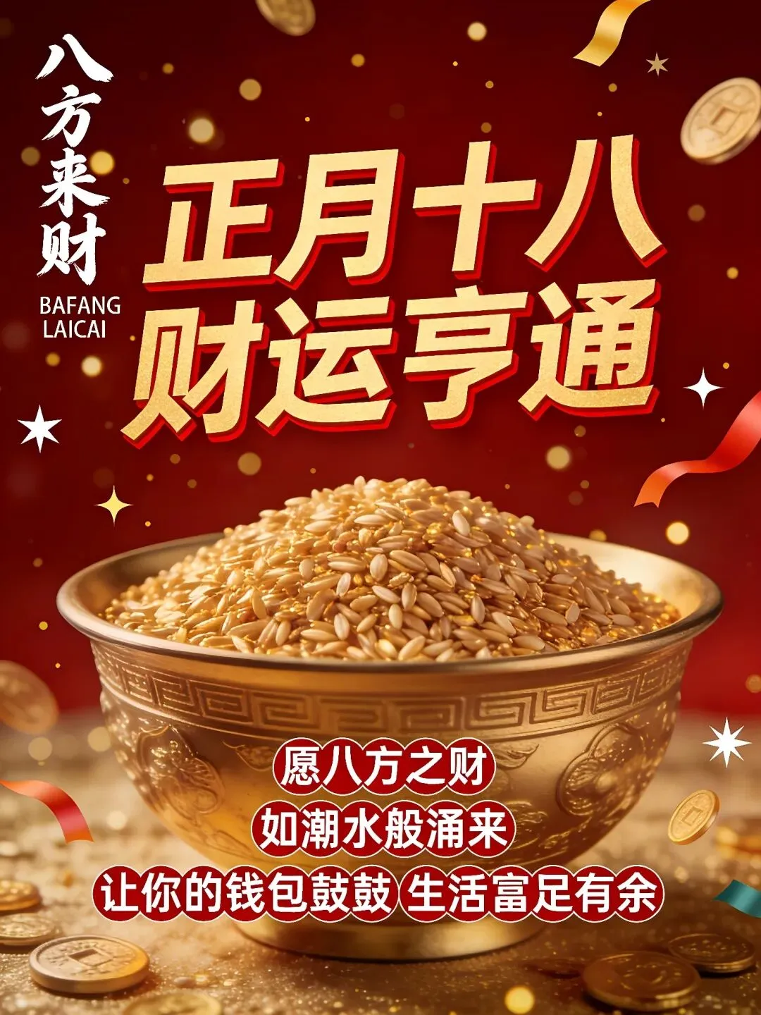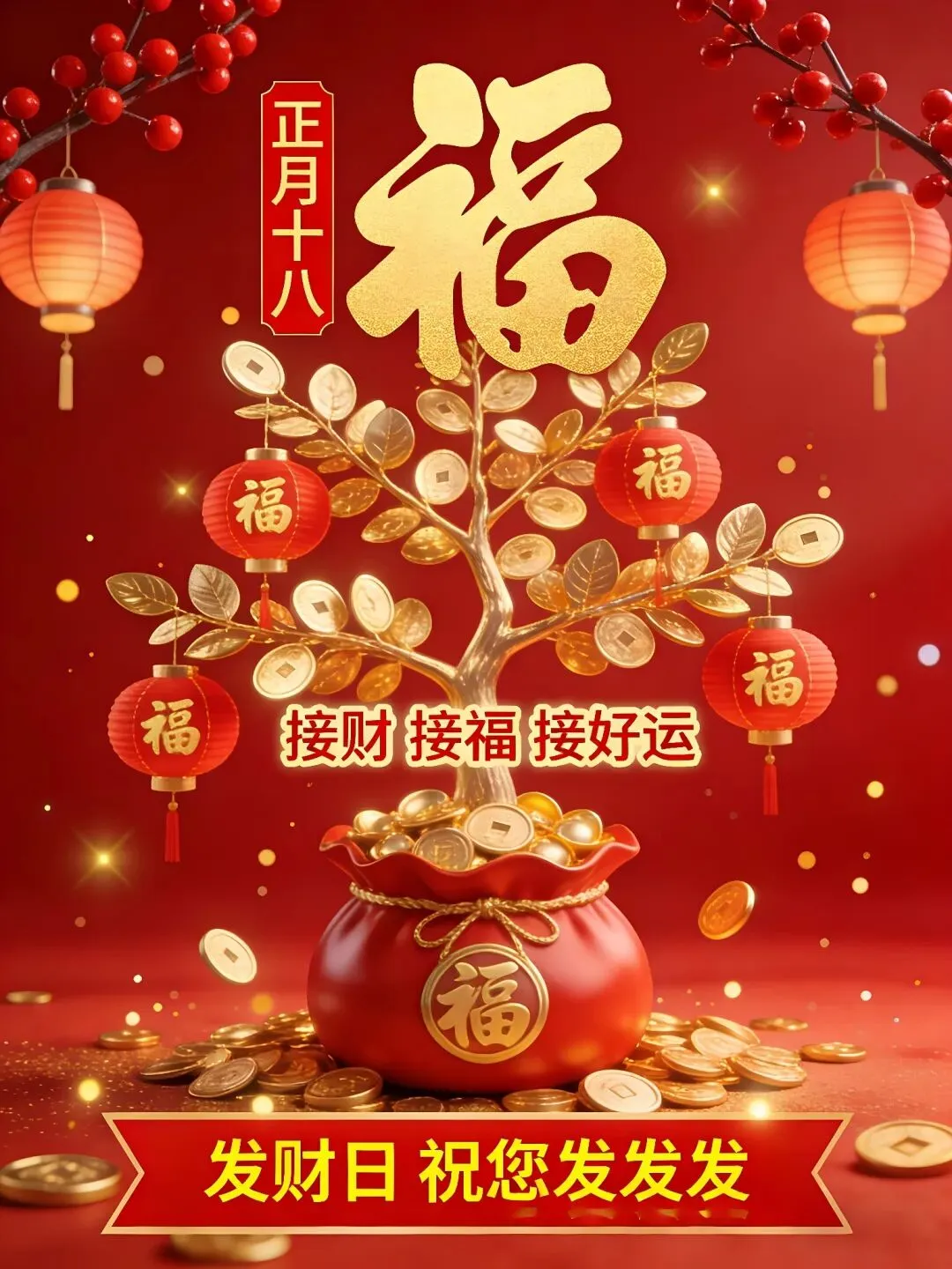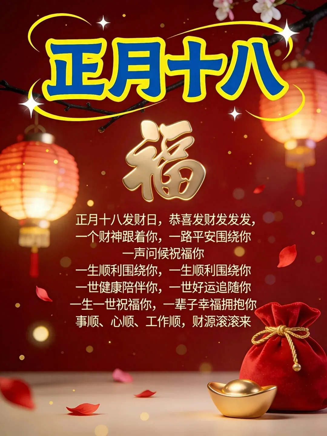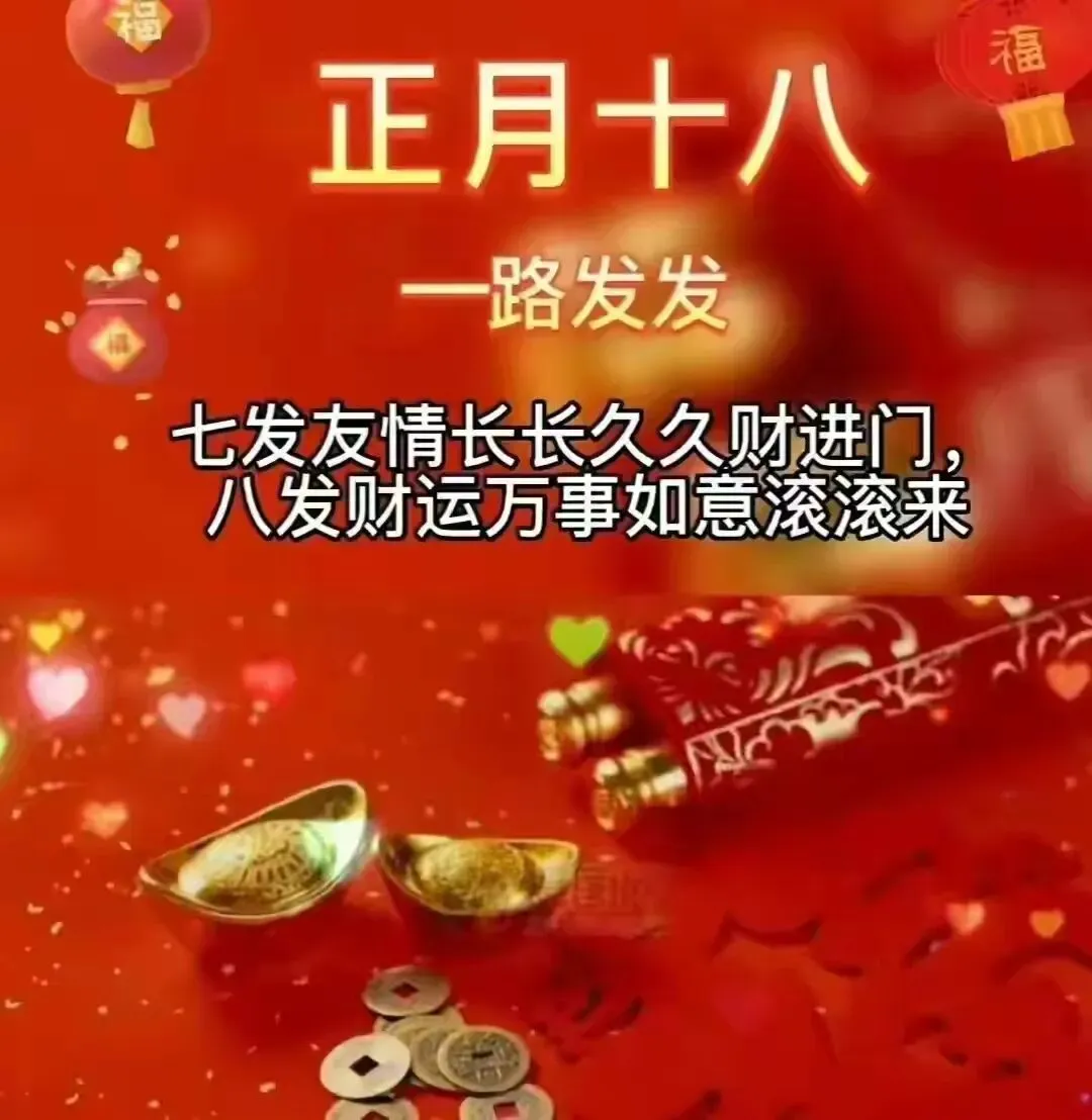 今天就是正月十八发财日,恭喜发财发发发,一个财神跟着你,一路平安围绕你,一声问候祝福你,一生顺利围绕你,一生健康陪伴你,一世好运追随你,一生一世祝福你,一辈子幸福拥抱你!