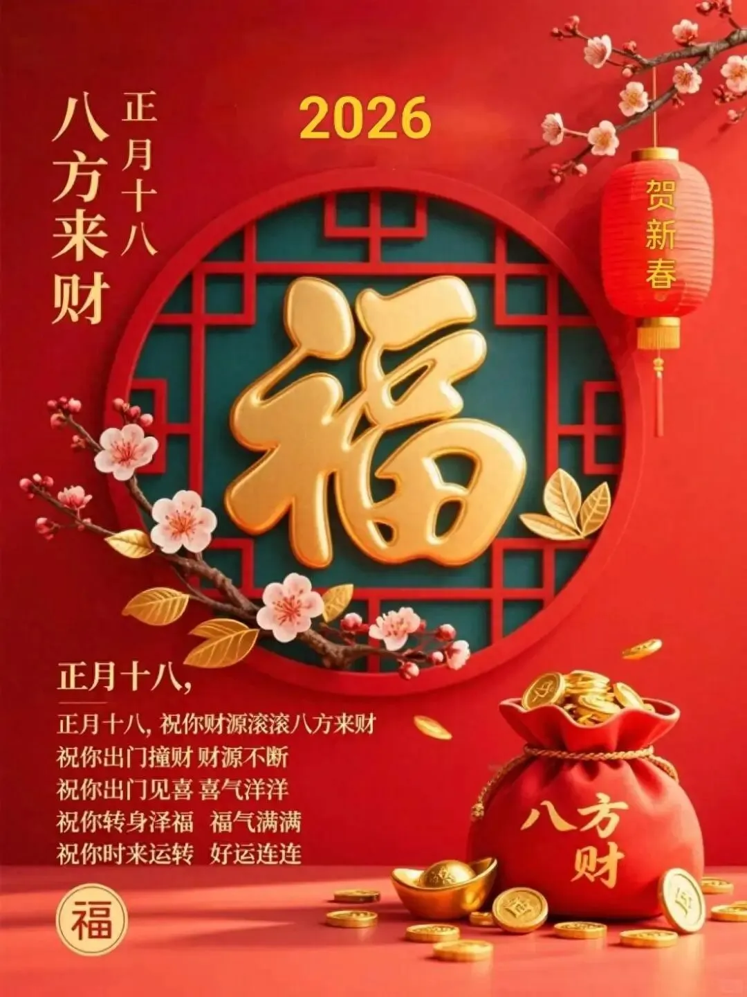 十八正月喜临门,祝福美好送你门。欢声笑语心中藏,幸福健康与你伴。财运亨通如意至,事业成功步步齐。祝您幸福新一年,万事如意年年好。