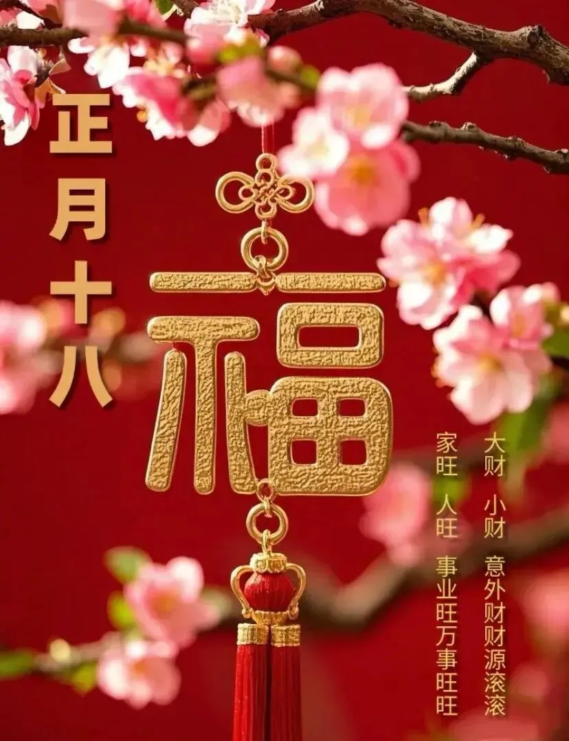 正月十八,诚心语,送上祝福话不虚。愿你福如东海,寿比南山,财运亨通,笑口常开;事业有成,健康长寿,新春快乐,幸福永远。愿你笑逐颜开,好运常在,喜气洋洋,福禄双全,吉祥如意,万事顺利!