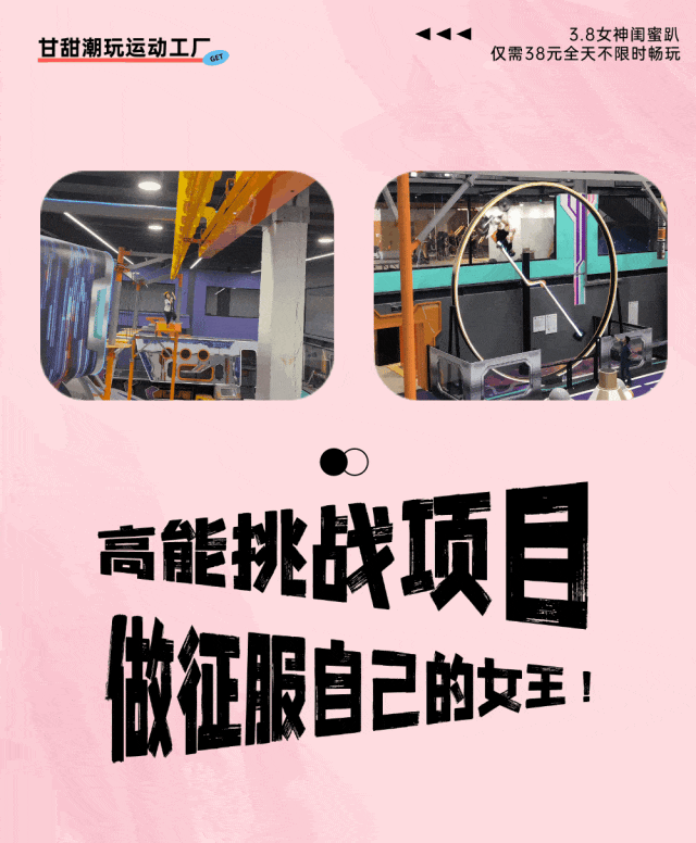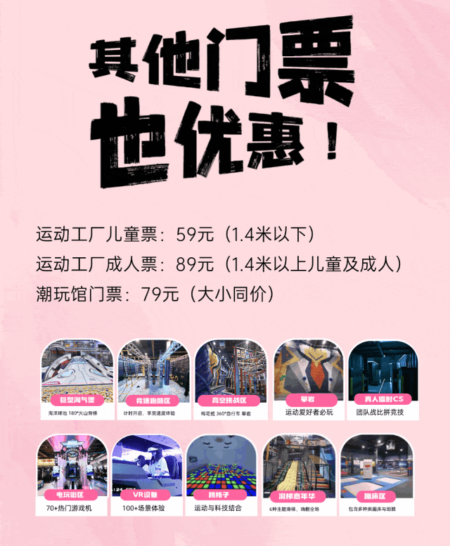 🌸上面如此这些,单馆全天不限时畅玩仅需38元(女神特惠限3.7-3.8两天),想要潮玩馆+运动馆,买2张,也才70多!太合适了!3.7-3.8约上闺蜜团一起来做回自己吧!